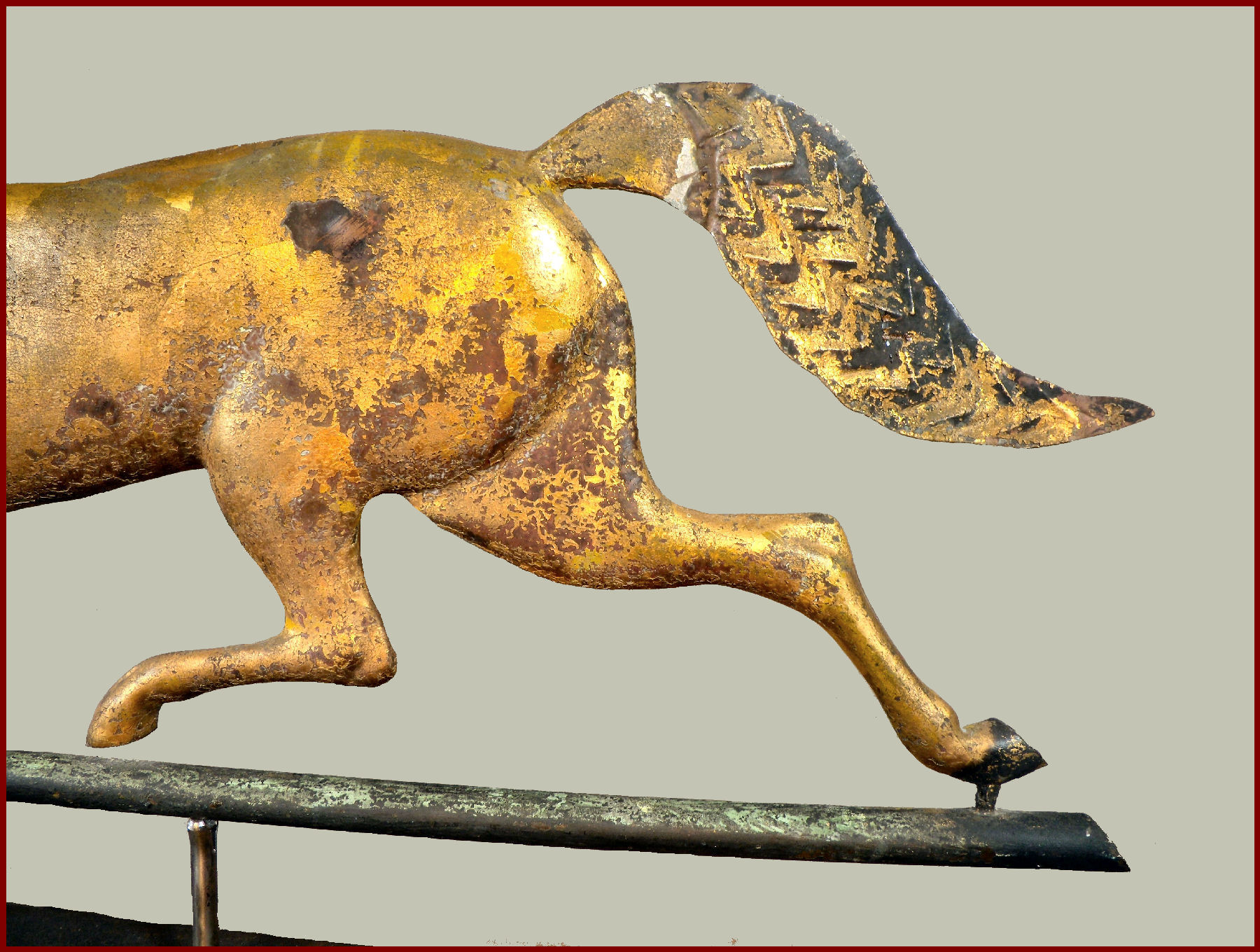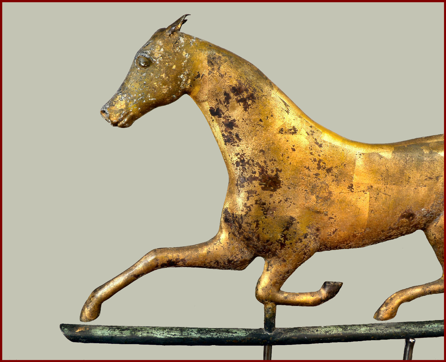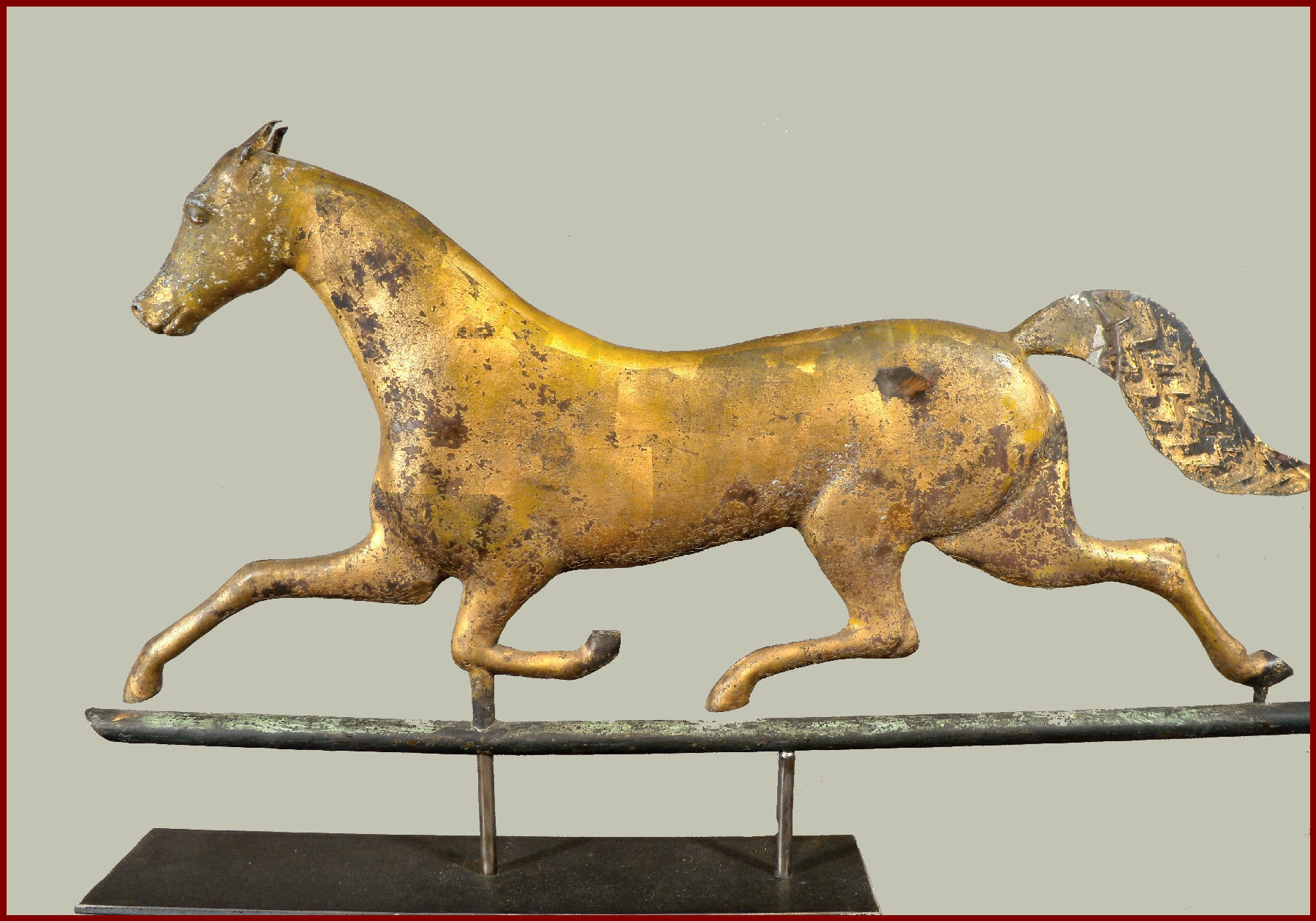 A 19th century running horse three dimensional full-bodied molded copper weathervane with a flowing sheet copper tail and a finely cast well defined zinc head having applied ears. The weathervane’s original condition is further complemented with a wonderful surface and patina.
