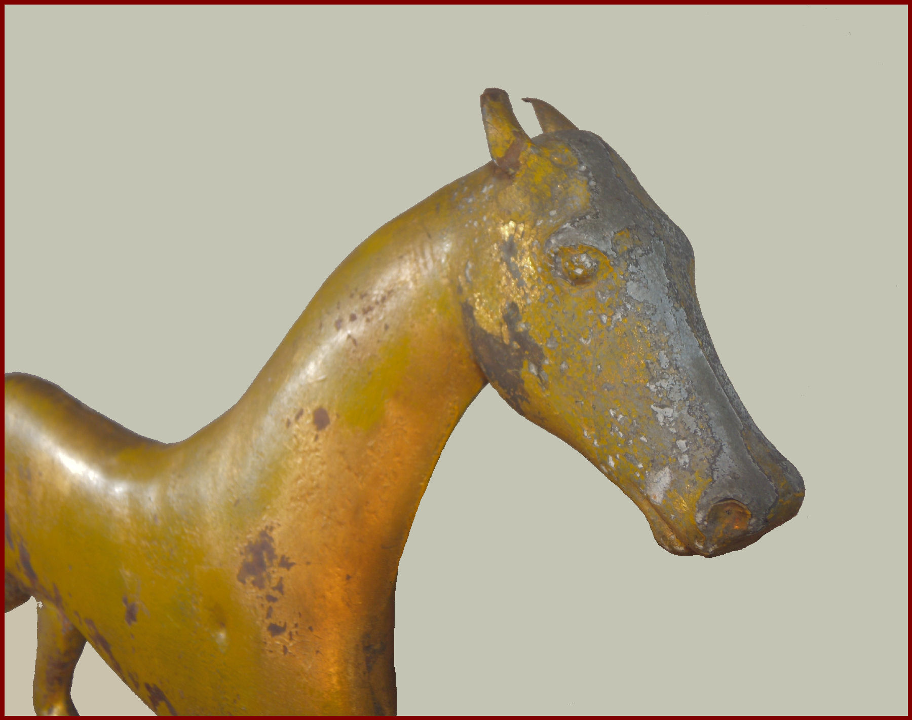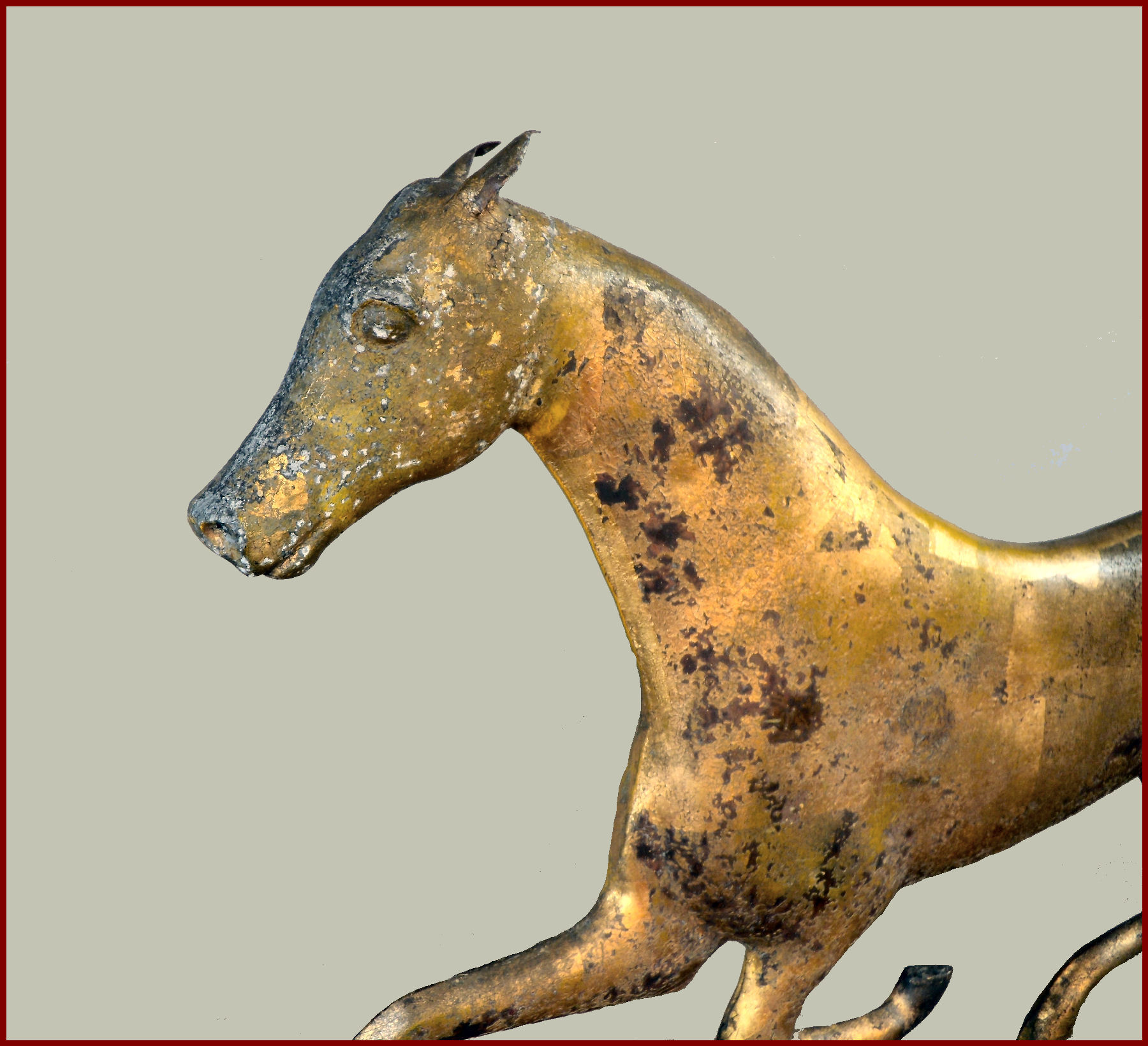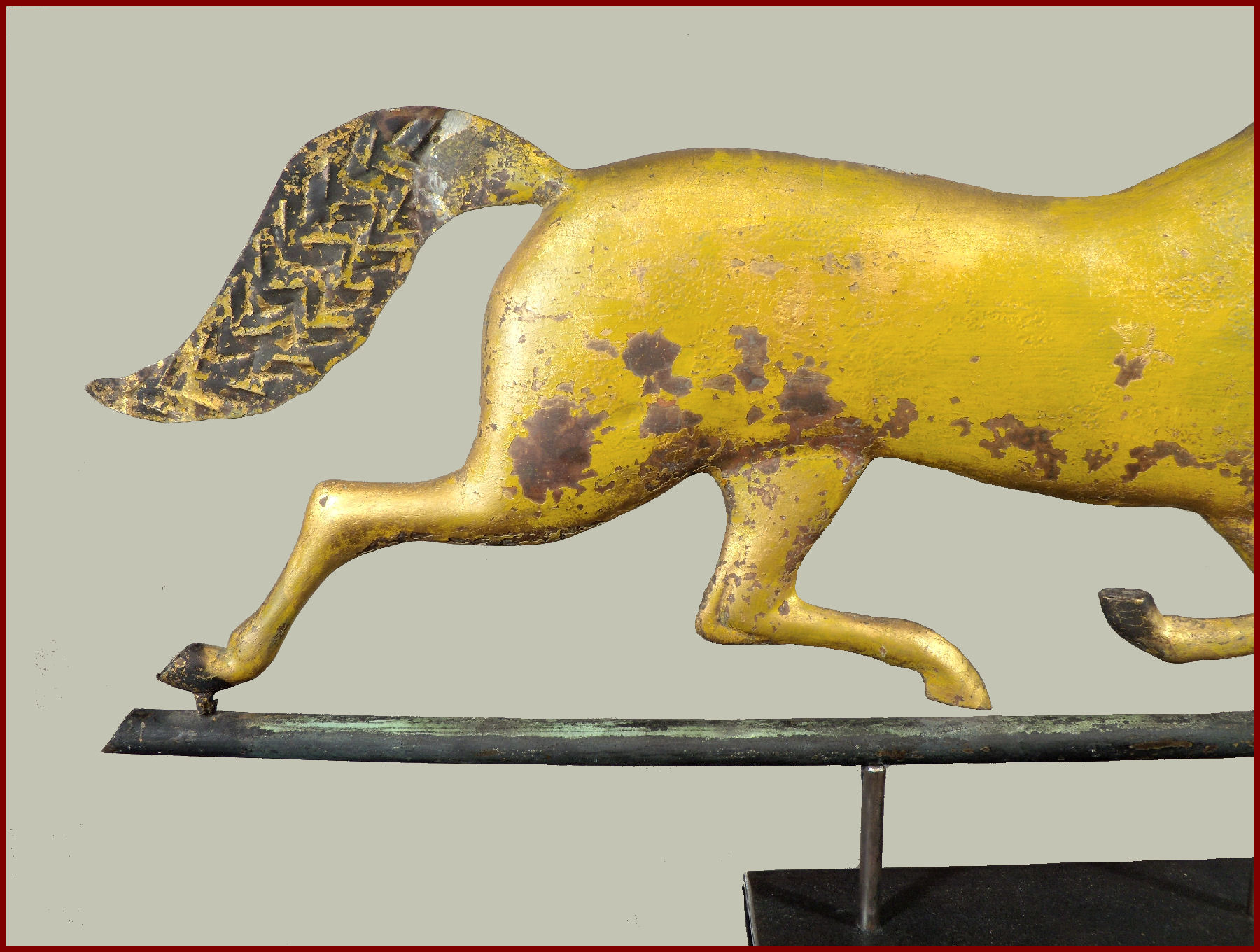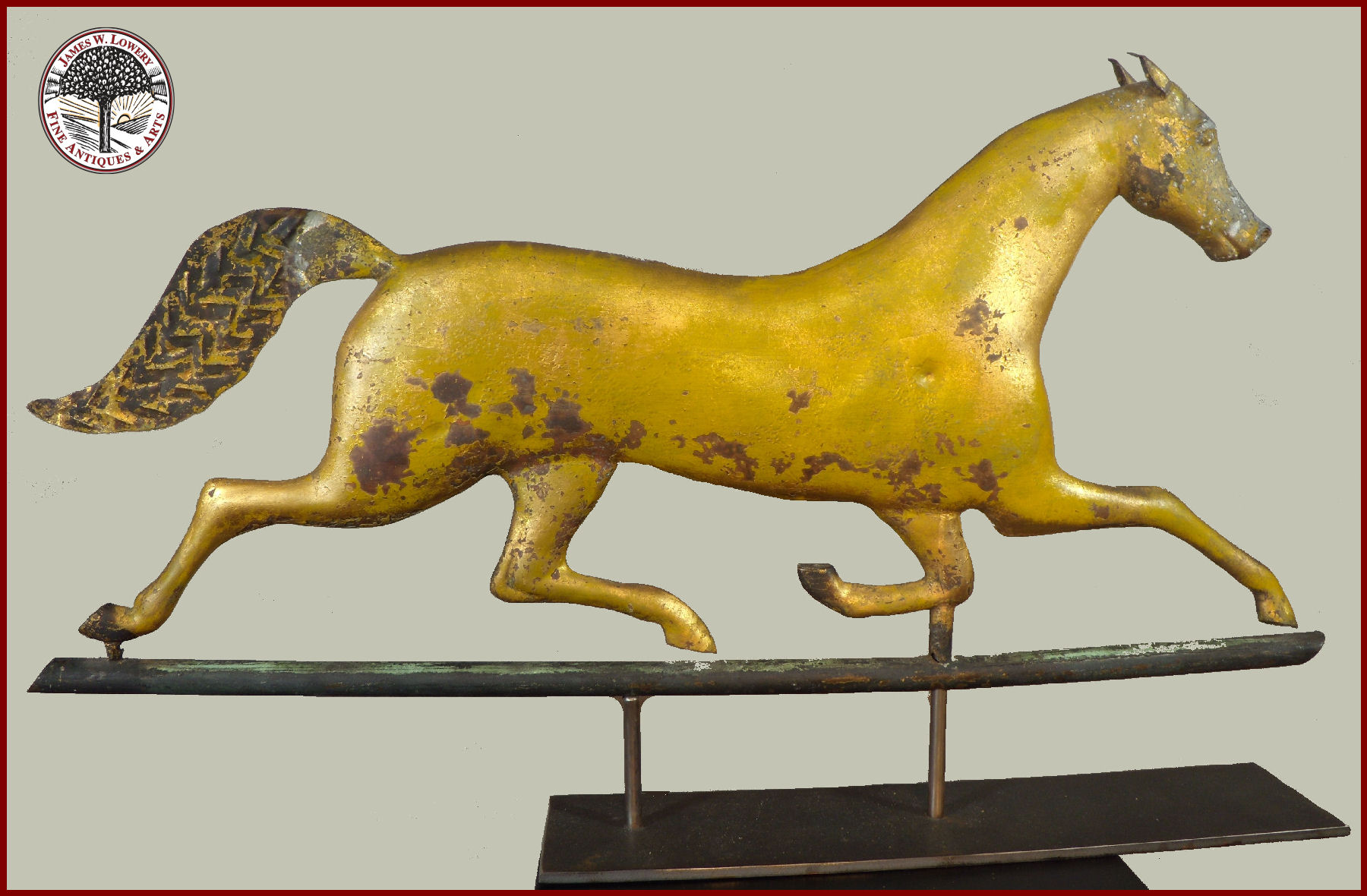 A 19th century running horse three dimensional full-bodied molded copper weathervane with a flowing sheet copper tail and a finely cast well defined zinc head having applied ears. The weathervane’s original condition is further complemented with a wonderful surface and patina.