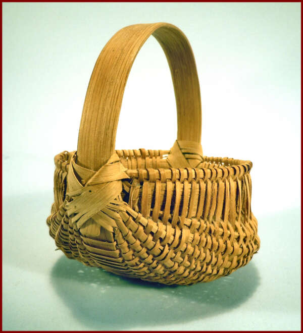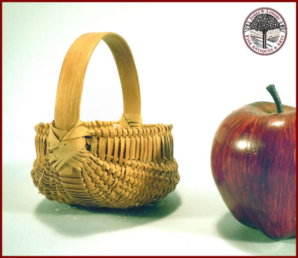 A 20th Century American Hand Woven Miniature Buttocks Basket. The basket is symmetrically made with the basic rib and splint type.having a original warm patina. The high arched handle is sturdy and beautifully designed. Splints are nice and tightly woven. The basket is attractive and very sturdy.