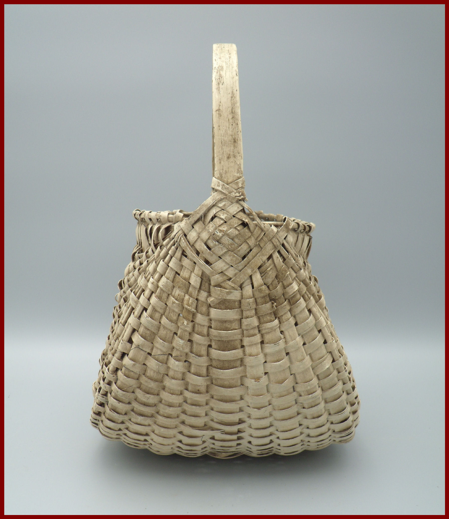 Painted white splint “ ORIOLE ” rib type nest-shaped basket with firm oak handle and rim, inter-woven reed ribs. Different “God’s eye” crossing handle supports. Wonderful “untouched” original condition.