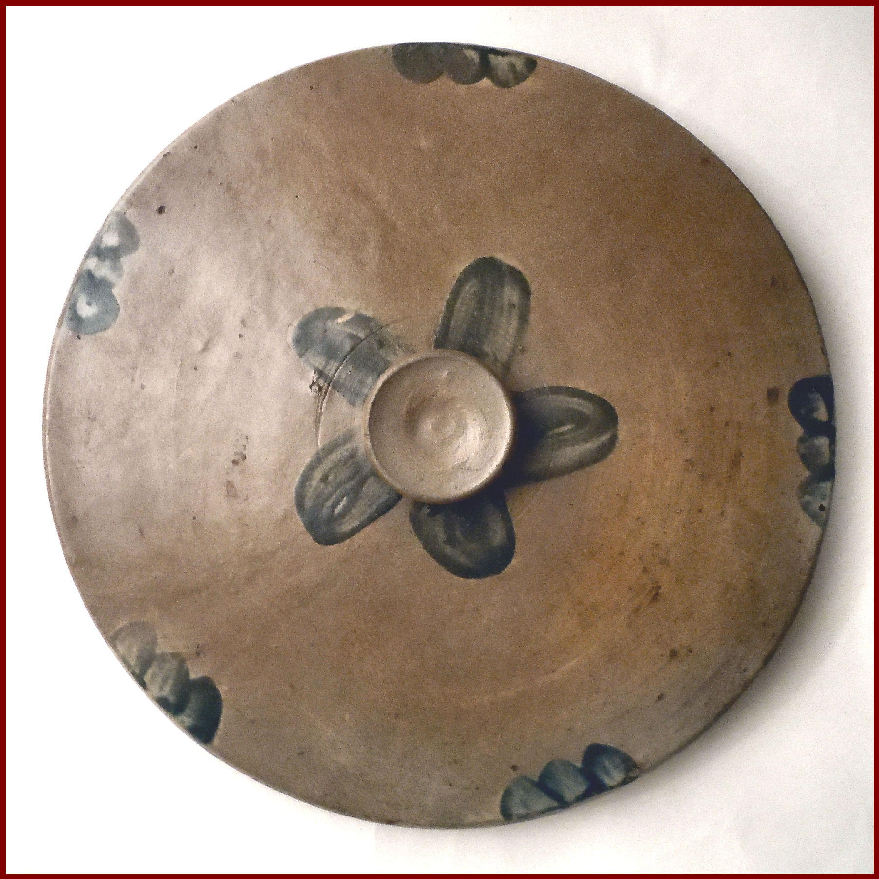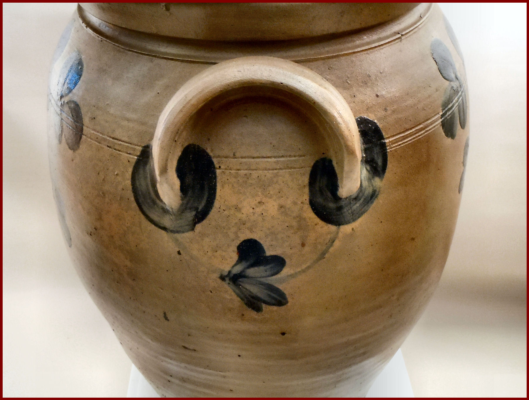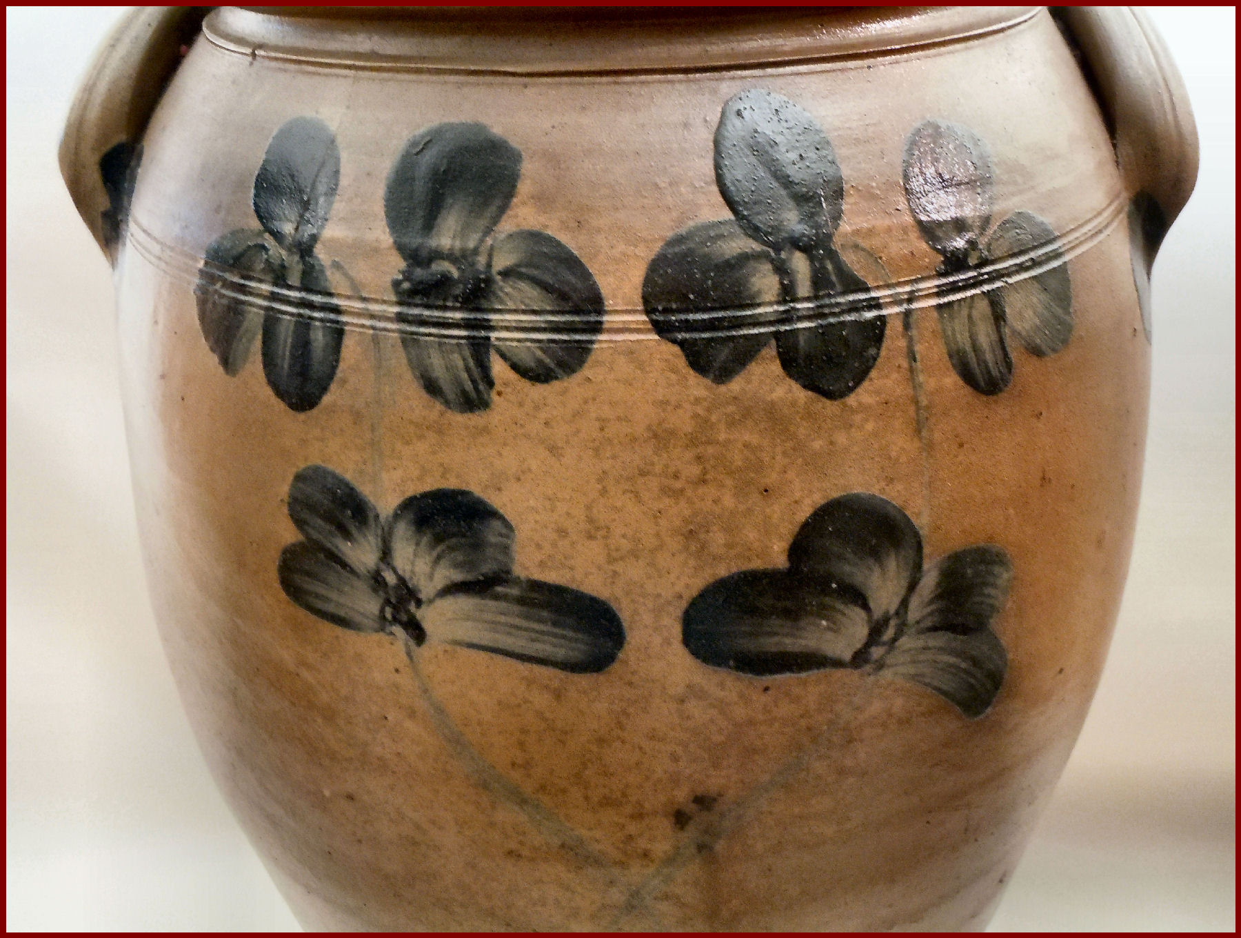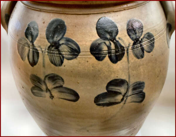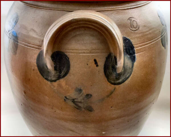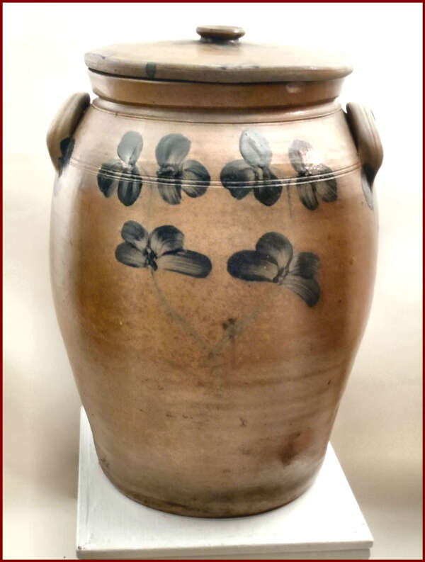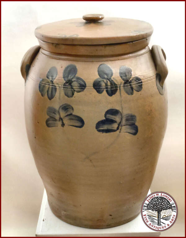 A very impressive ten gallon Stoneware Crock decorated with a characteristic stemmed clover motif design that is associated with wares made in Baltimore, MD. A sweeping pattern of brushed flowers enhances this rare oversize vessel – a Classic Peter Hermann, one of Maryland’s premier 19th century potters. The professionally restored crock has great lines, it is big and bold with the original cobalt-decorated lid. This wonderful example will make a superb addition to any collection of stoneware or early American antiques.