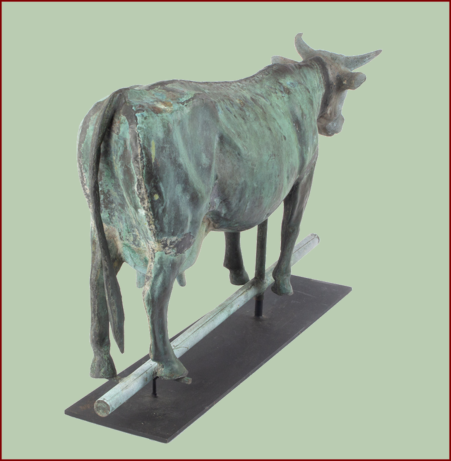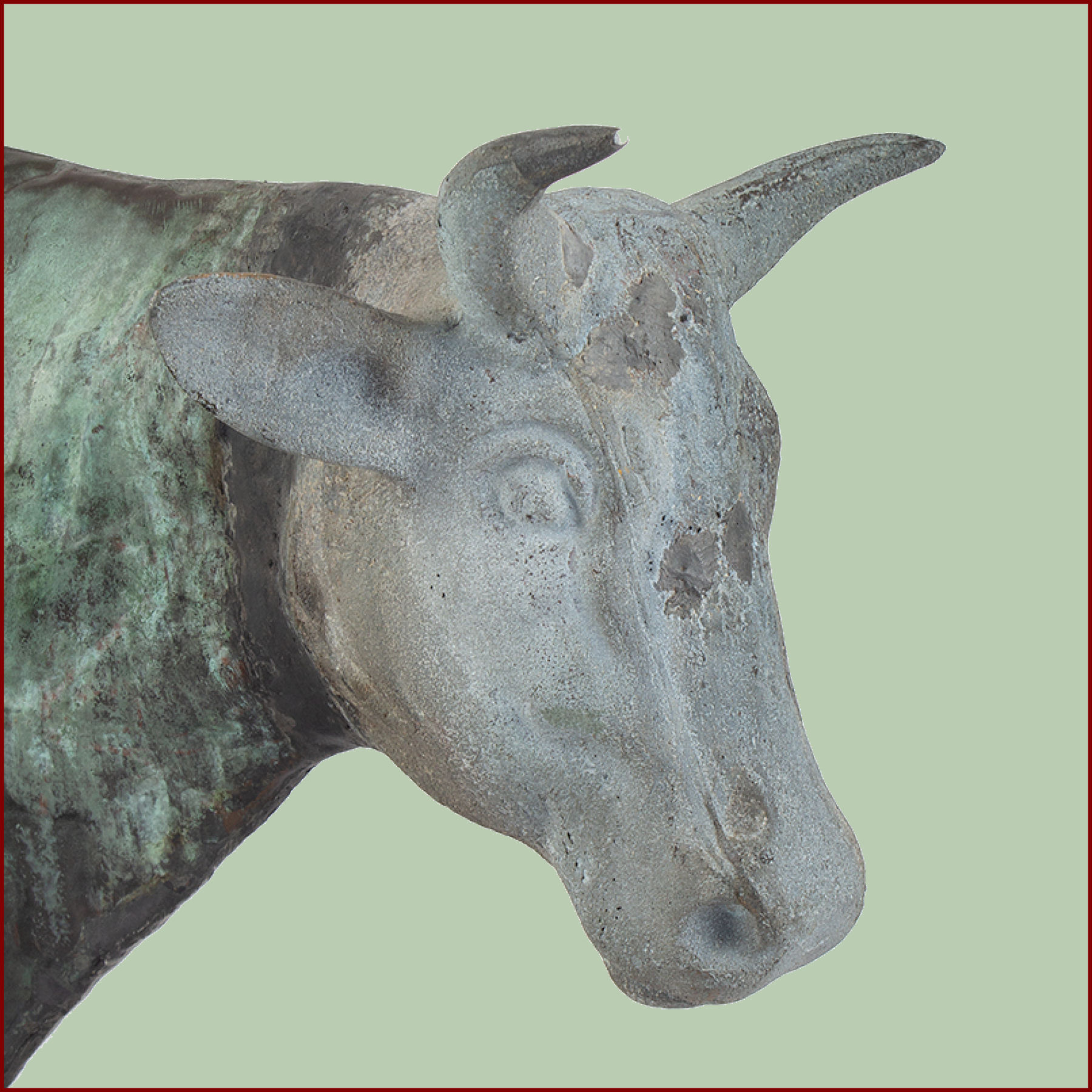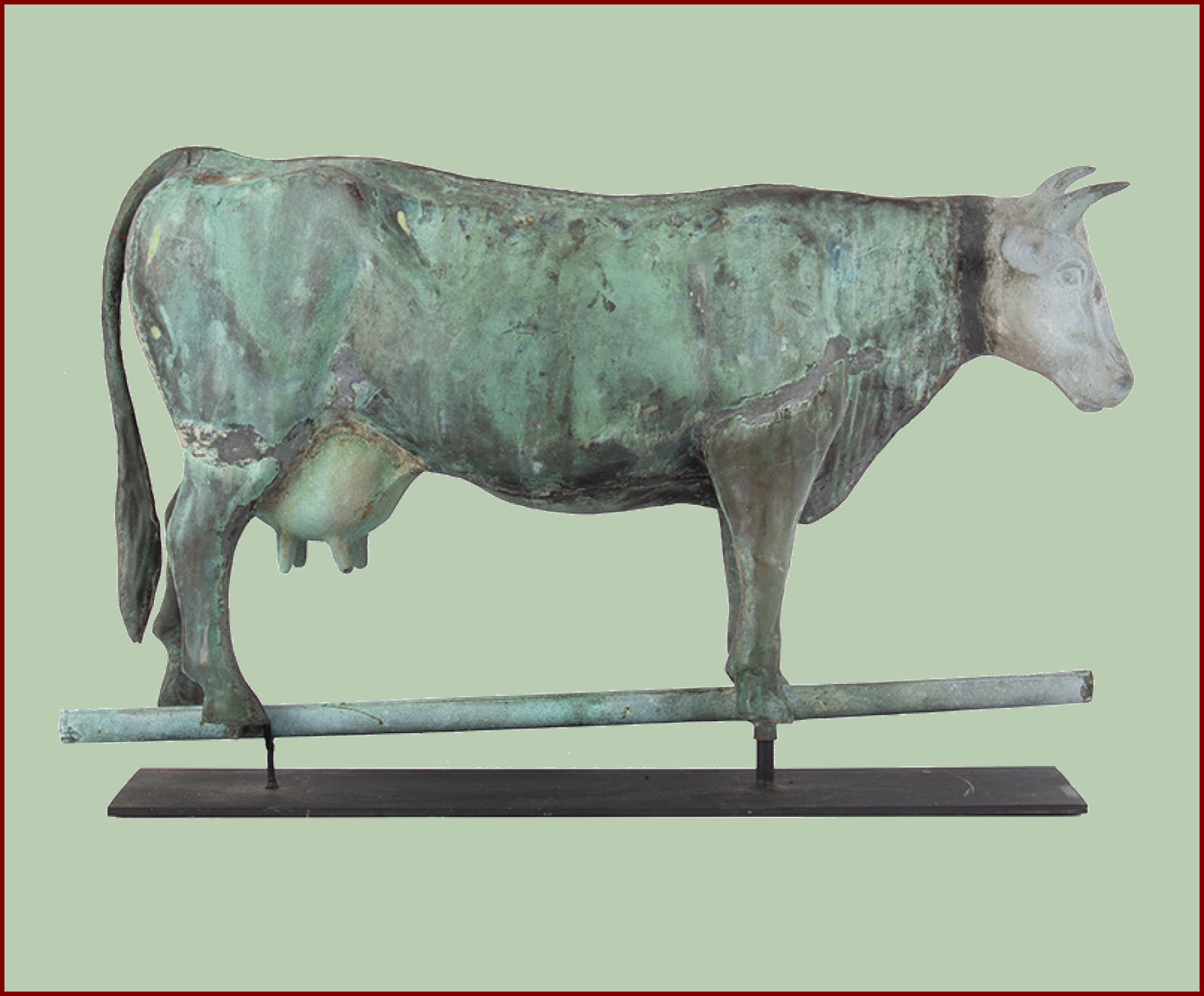 A finely crafted Cow Weathervane that is displaying fine dimensional quality with wonderful form made in its day by one of the premier weathervane manufacturers. This unrestored full-bodied form, made of hammered copper has a fabulous cast zinc head and utters. Complimenting the cows originality is its original weathered patina.