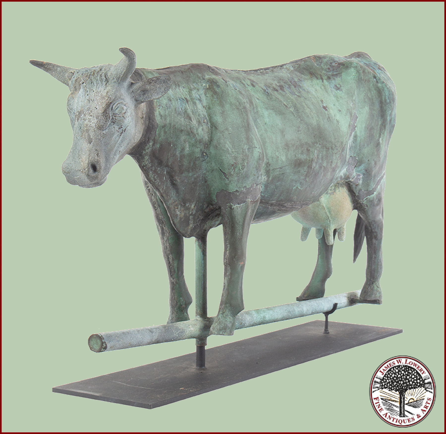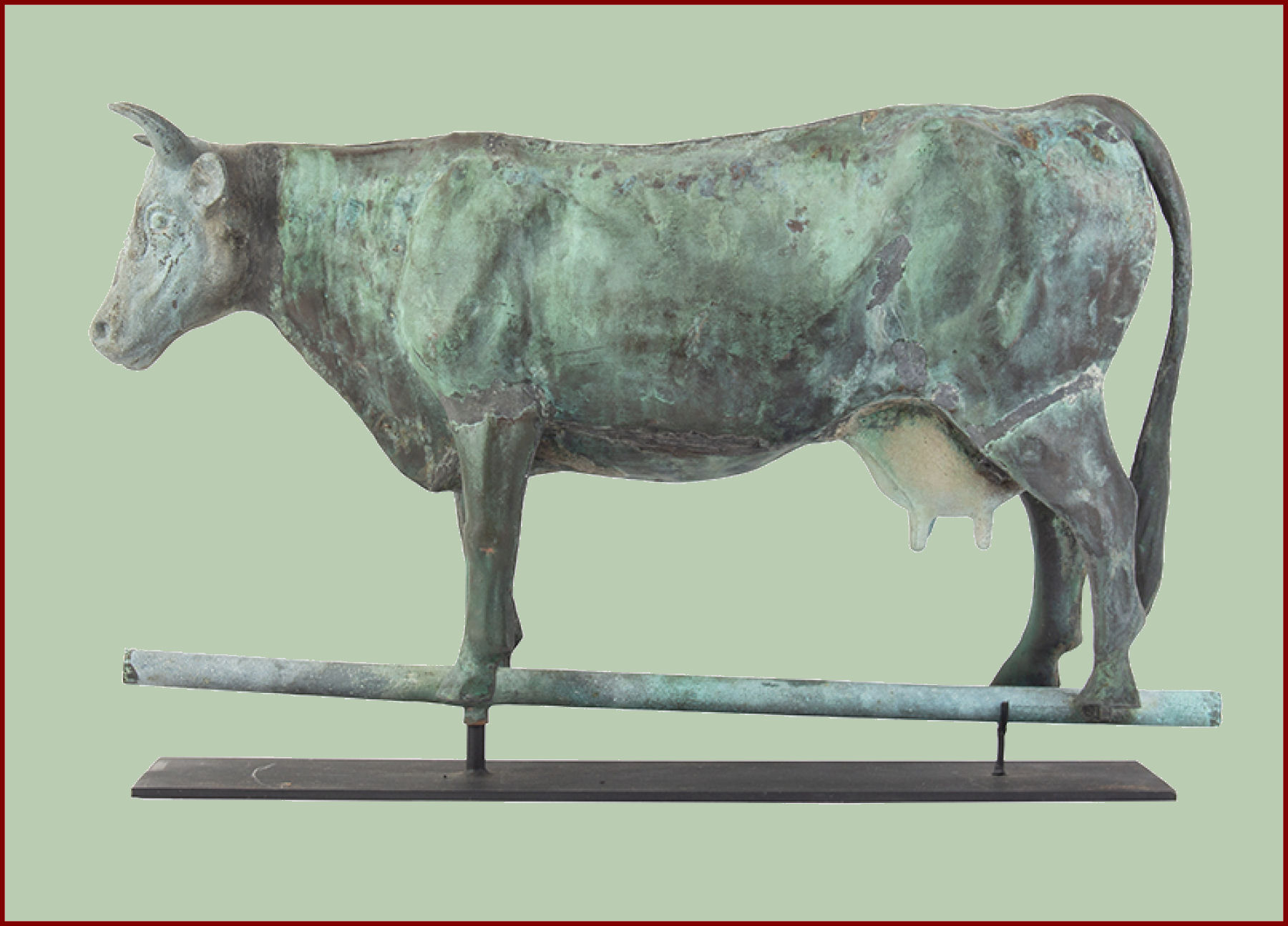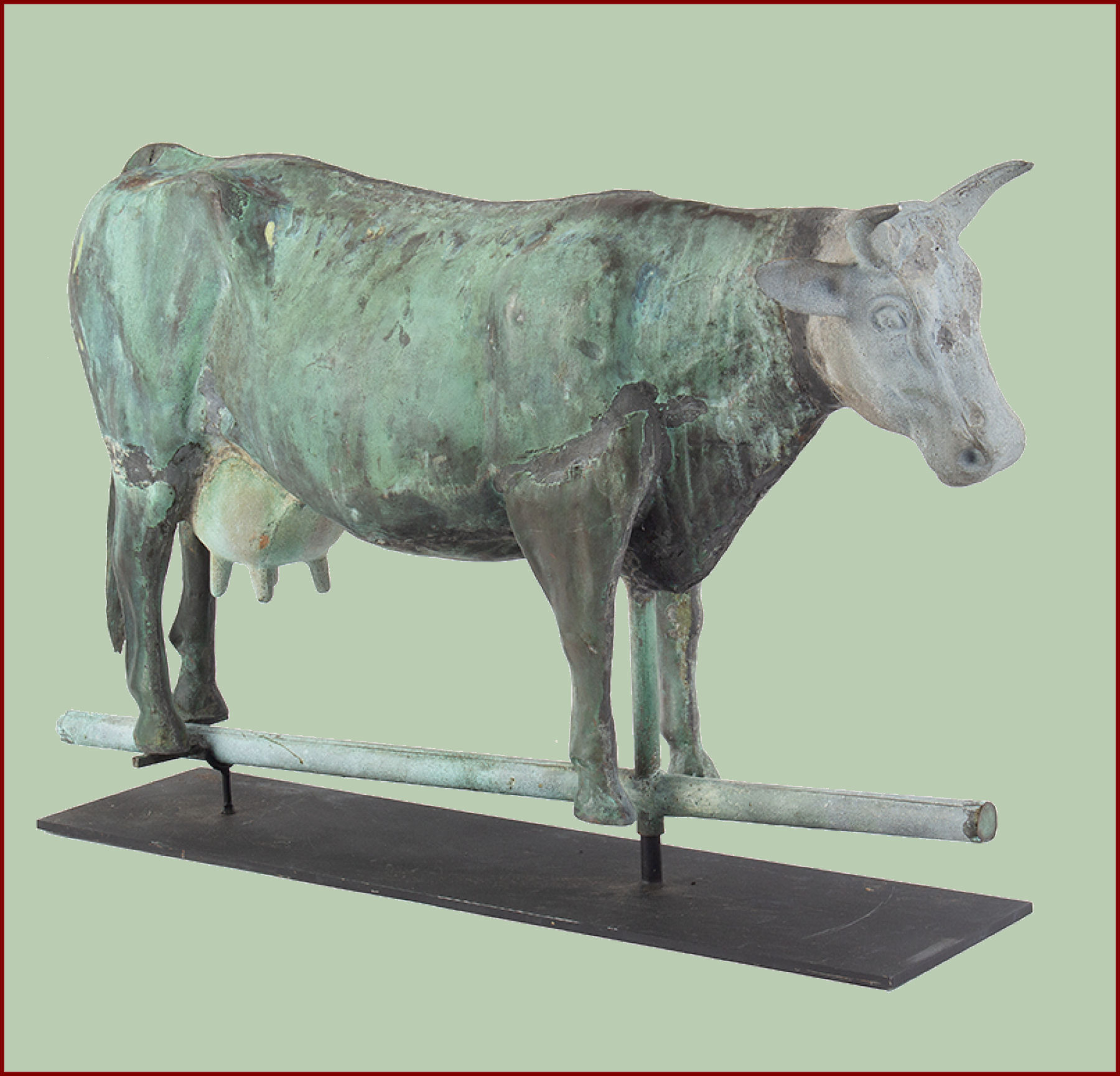 A finely crafted Cow Weathervane that is displaying fine dimensional quality with wonderful form made in its day by one of the premier weathervane manufacturers. This unrestored full-bodied form, made of hammered copper has a fabulous cast zinc head and utters. Complimenting the cows originality is its original weathered patina.