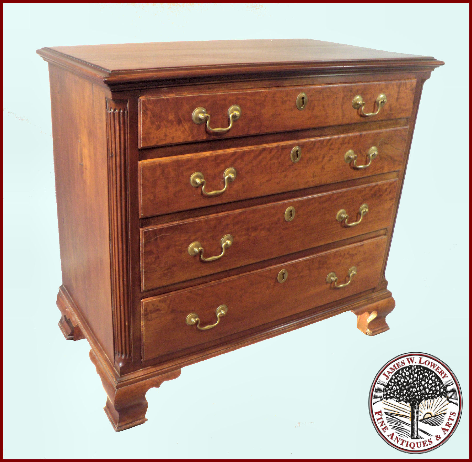 The serene character of this chest of drawers exemplifies the standards of Pennsylvania Cabinetmakers. The top has a applied molding that projects gently over the front and sides with overhang on back for chair rail. The facade has four graduated drawers with thumbnail edges and original bail brasses. Drawer fronts are a figured cherry having a most interesting grain reserved for the faces. Between each drawer is a full depth dust-board. Flanked on facing corners are fluted and turned columns, capitals and footers. The case terminates to a conforming molded edge above four well developed original ogee bracket feet with shaped knee returns.