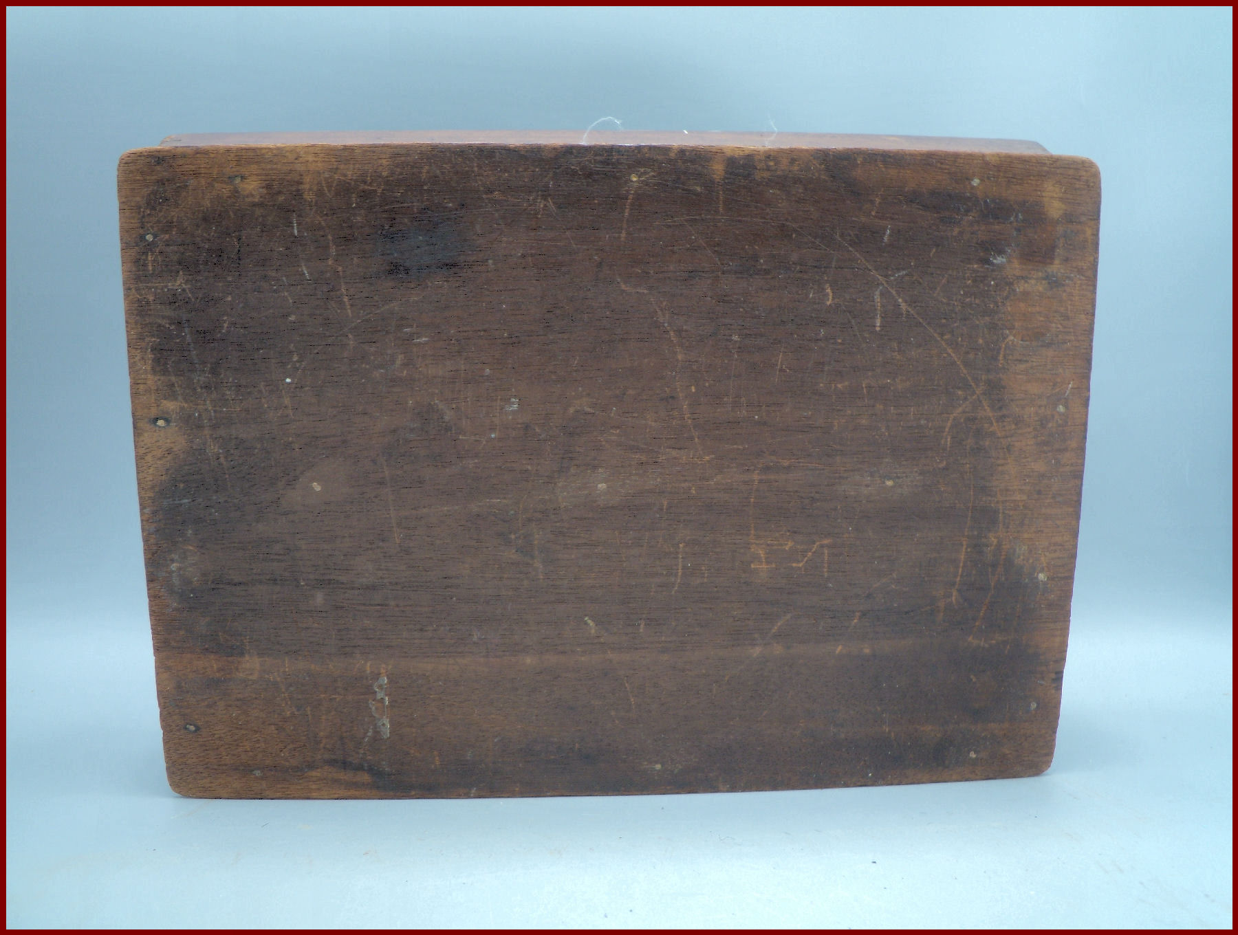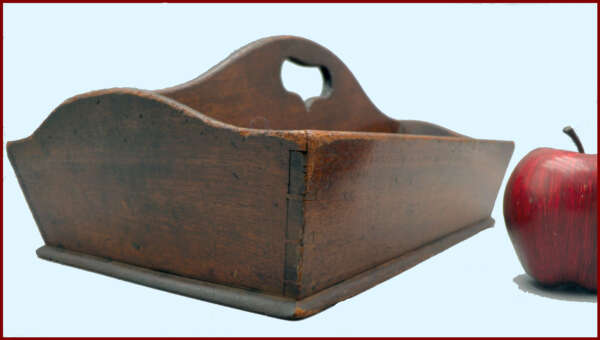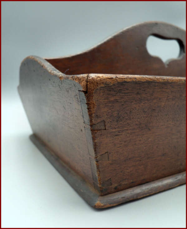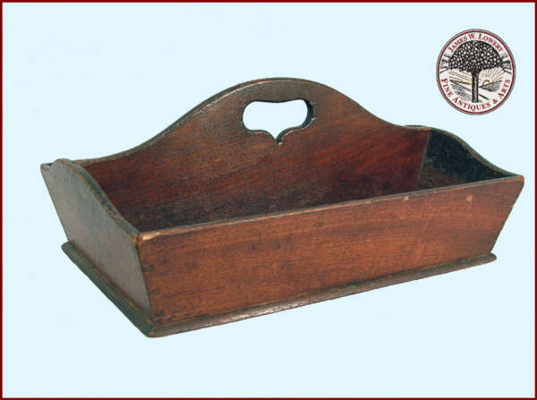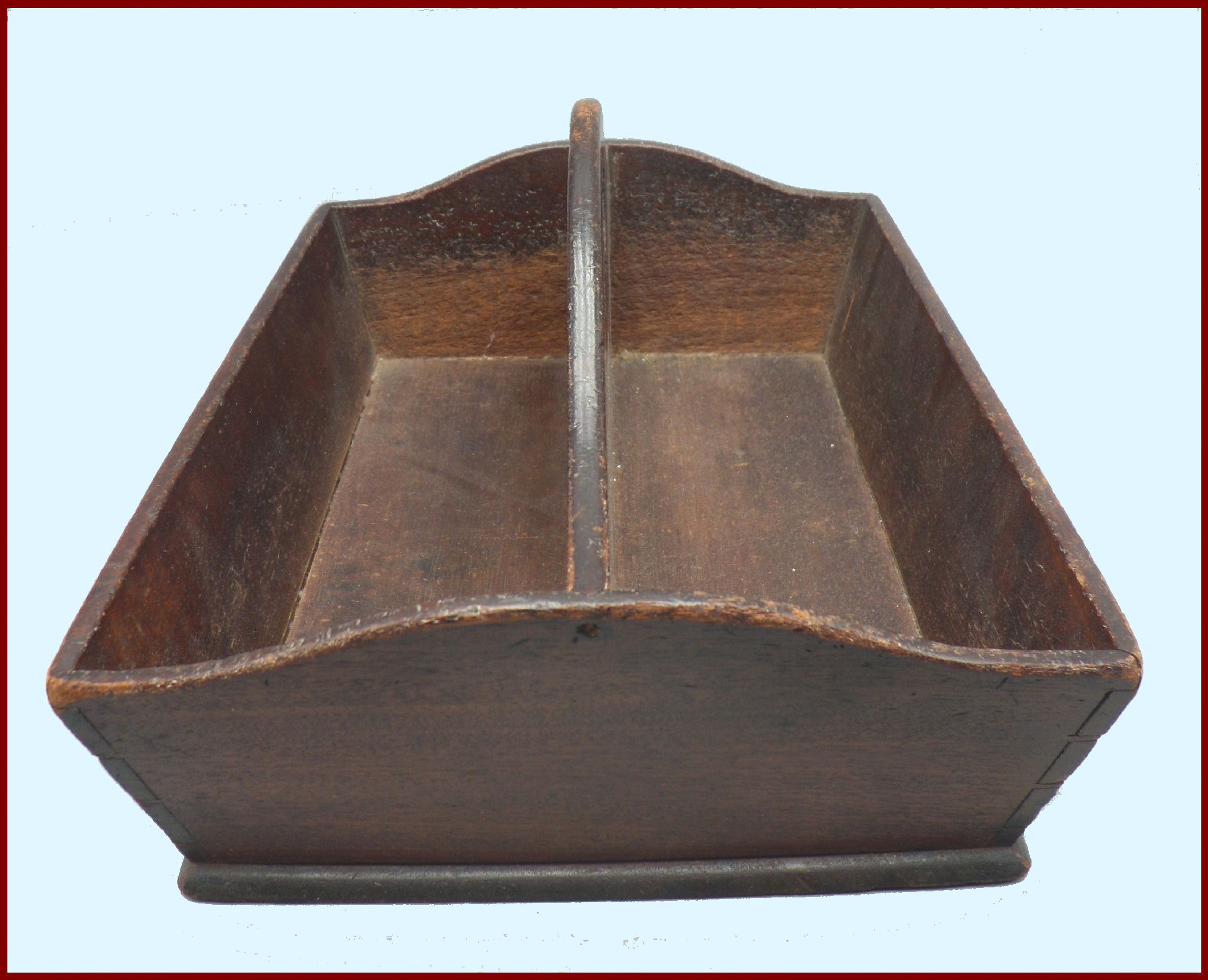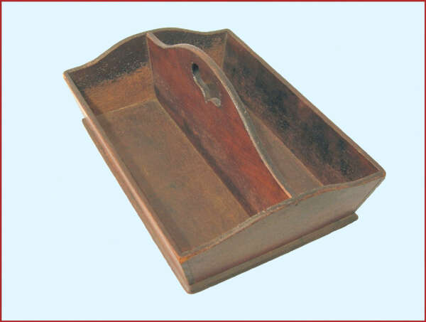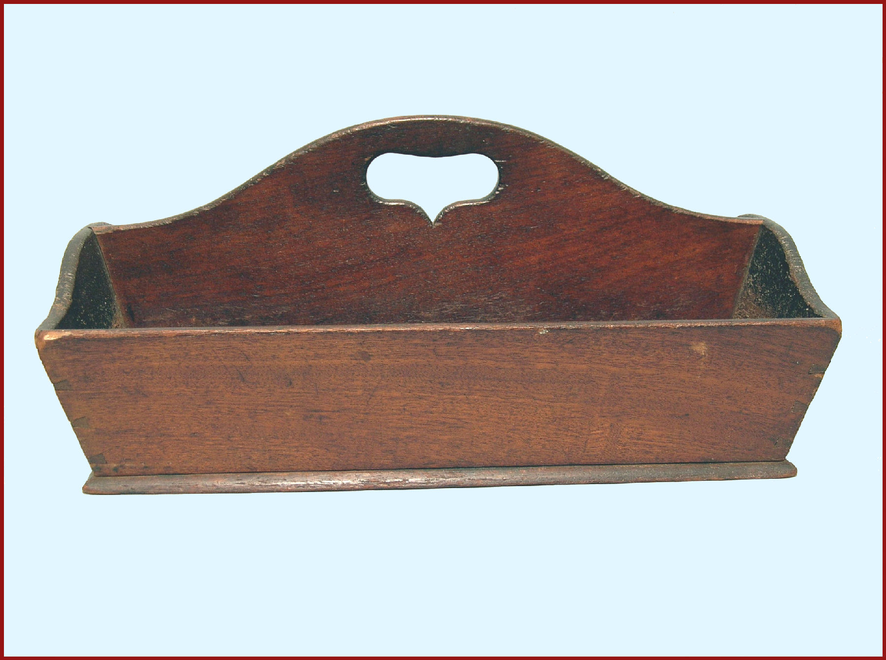An America utilitarian tray used for storage, as well as, transporting cutlery. Its high shaped central handle servers as a divider with its smaller sides conforming in shape. The larger sides are straight accenting the heart cutout in the carrying handle. All four sides are flaring outwards with fine dovetail construction.