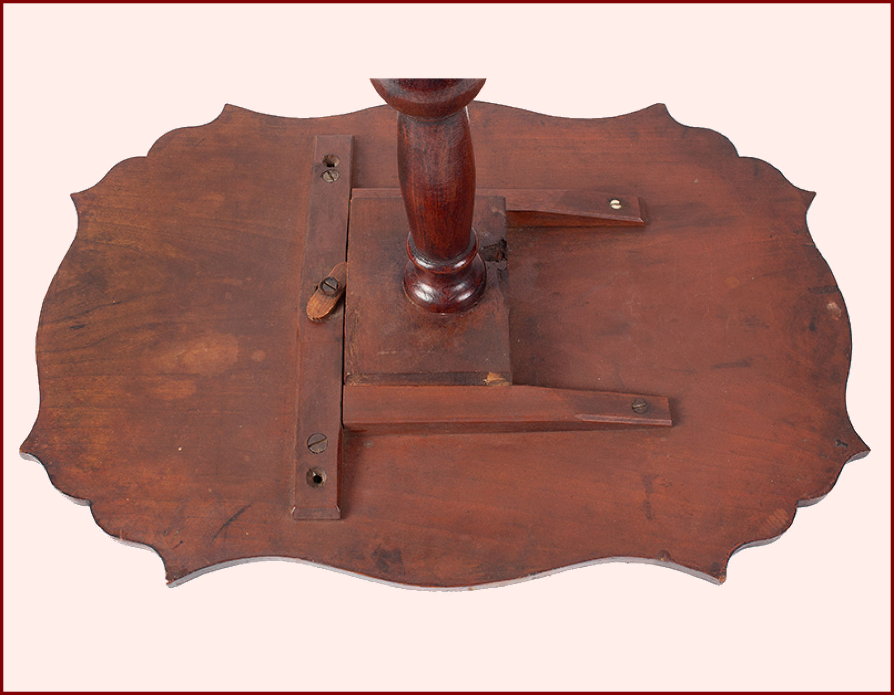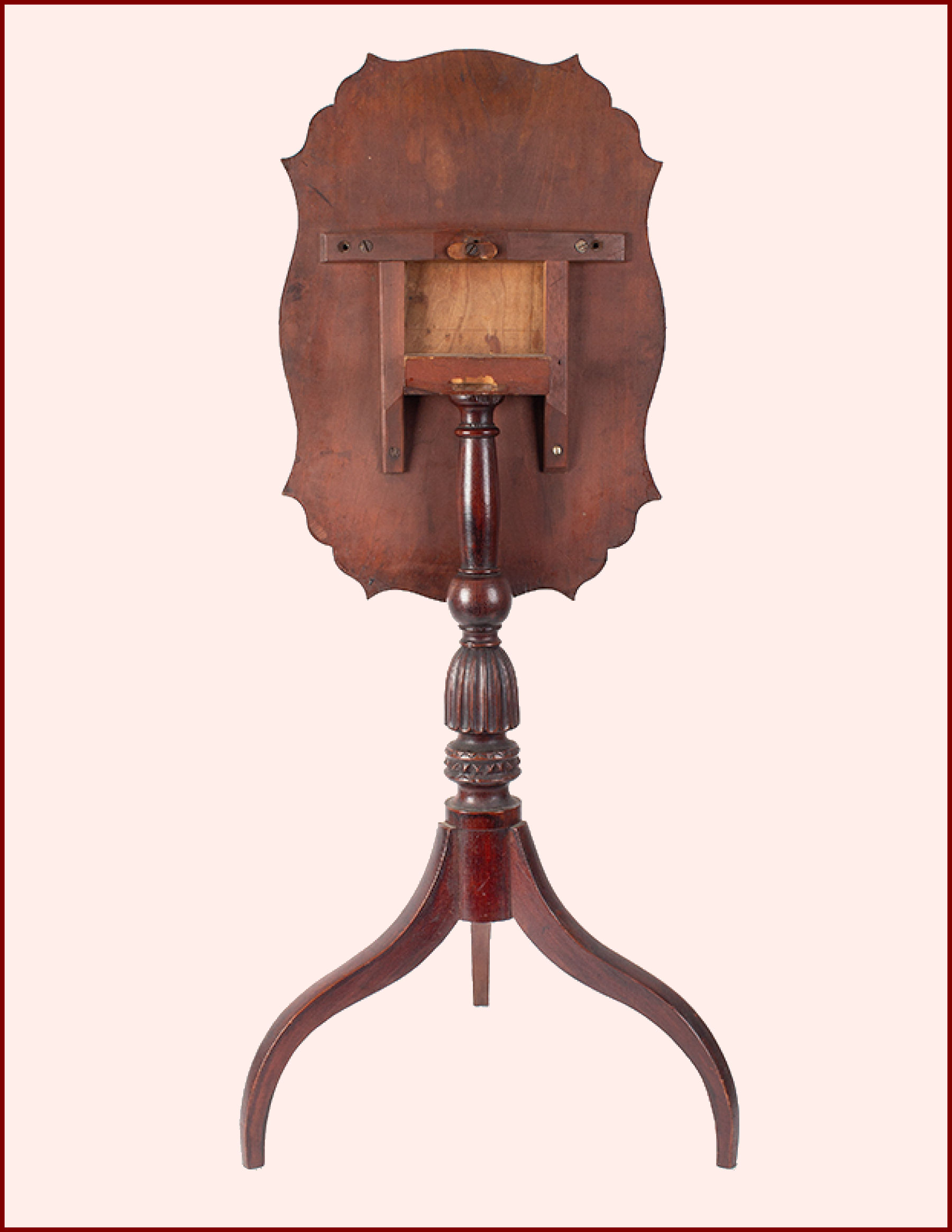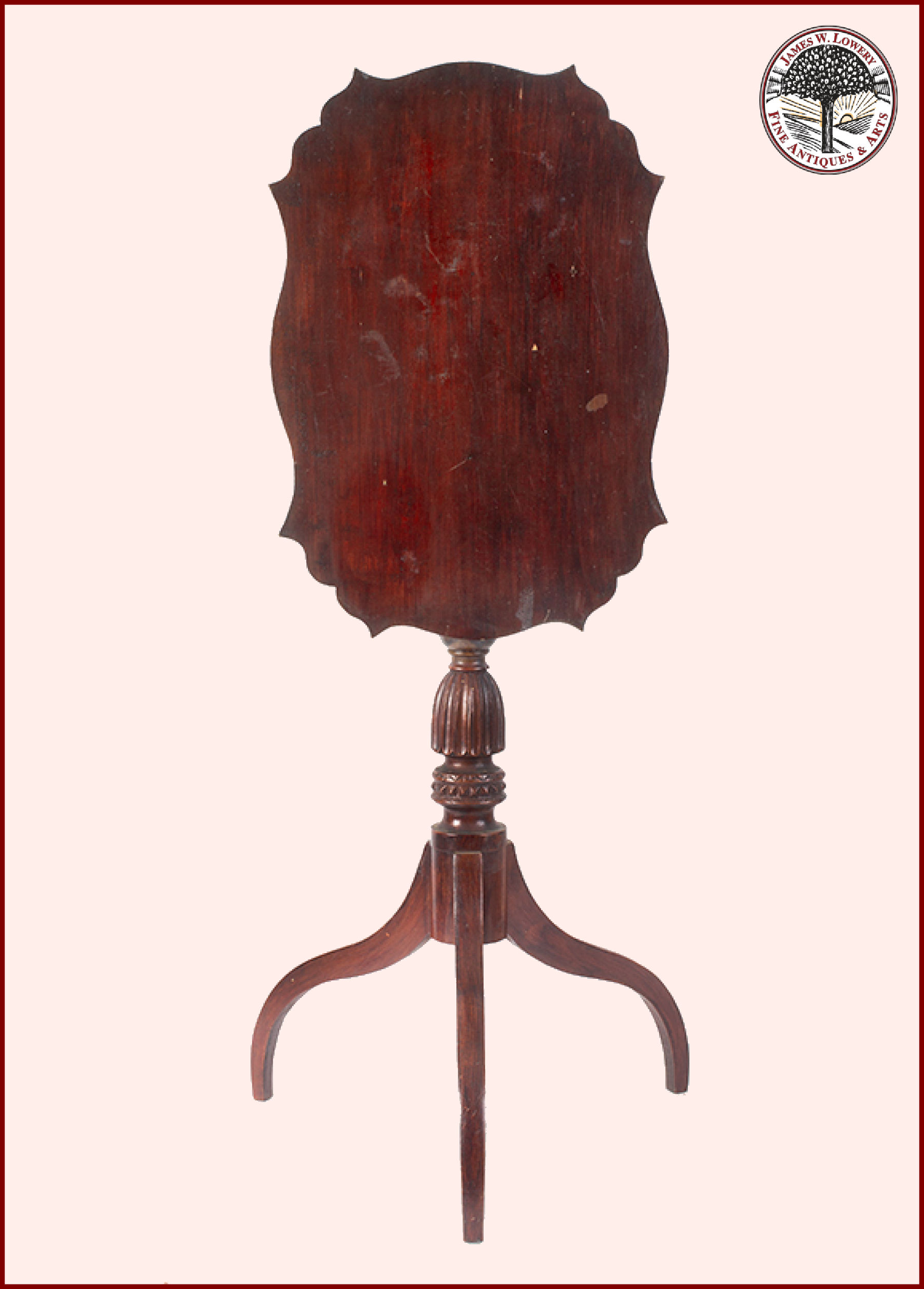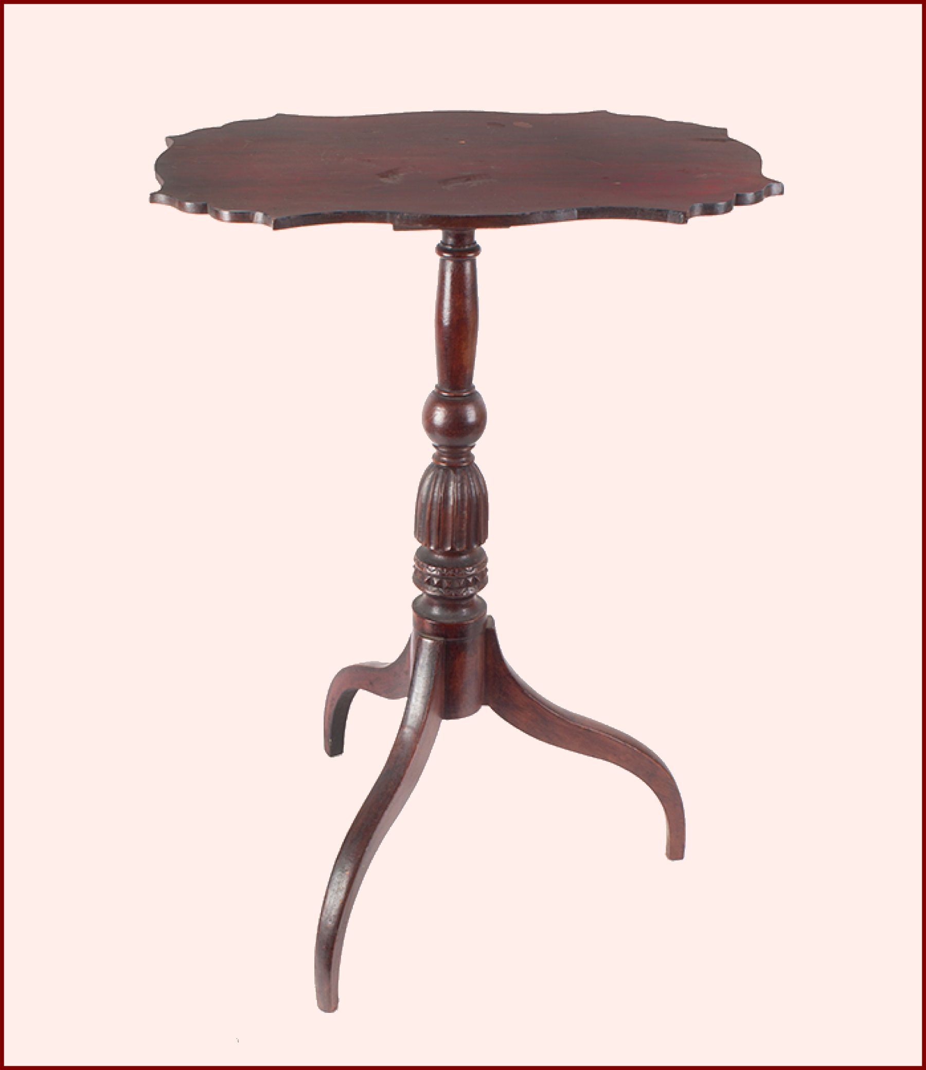 Hepplewhite tilt-top painted candlestand in outstanding condition. A serpentine shaped top displaying great style above its fabulously turned and carved standard which terminates to high delicate spider legs. Stand retaining original grain painted surface.