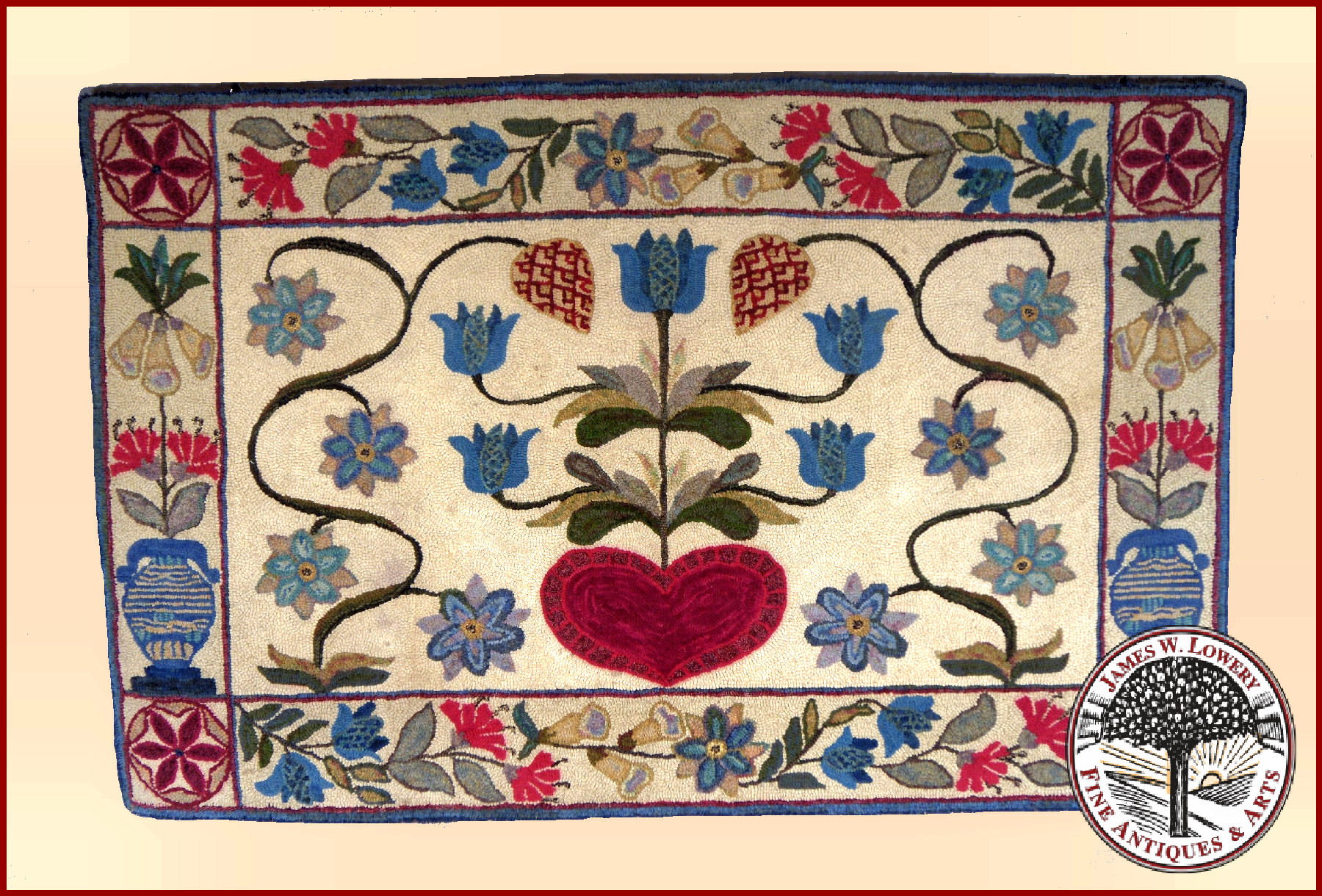 Central panel with blue tulips arising from large heart with vines and flowers adjacent. Corresponding on border are hex signs, vines with flowers and urns with flowers.