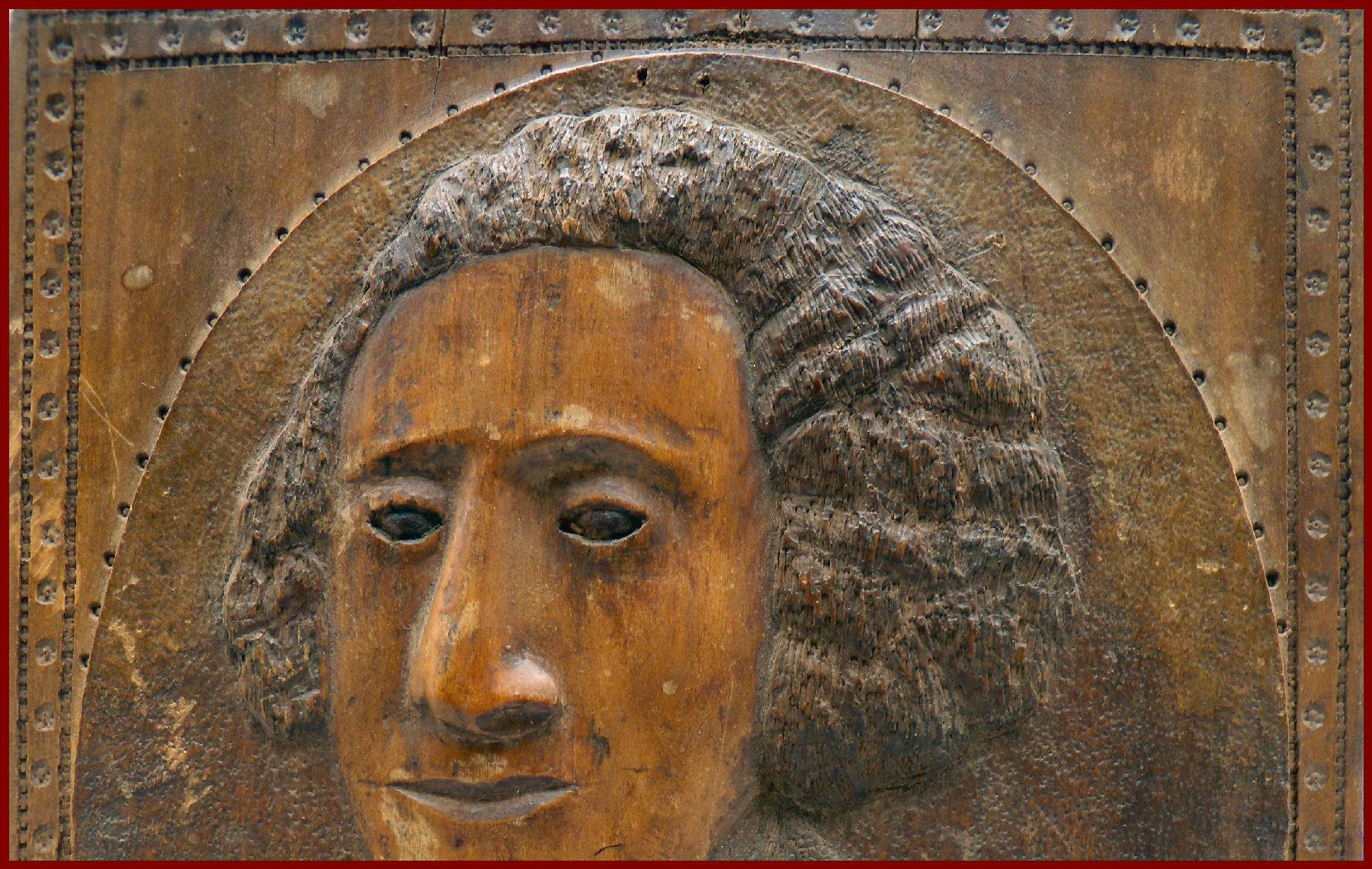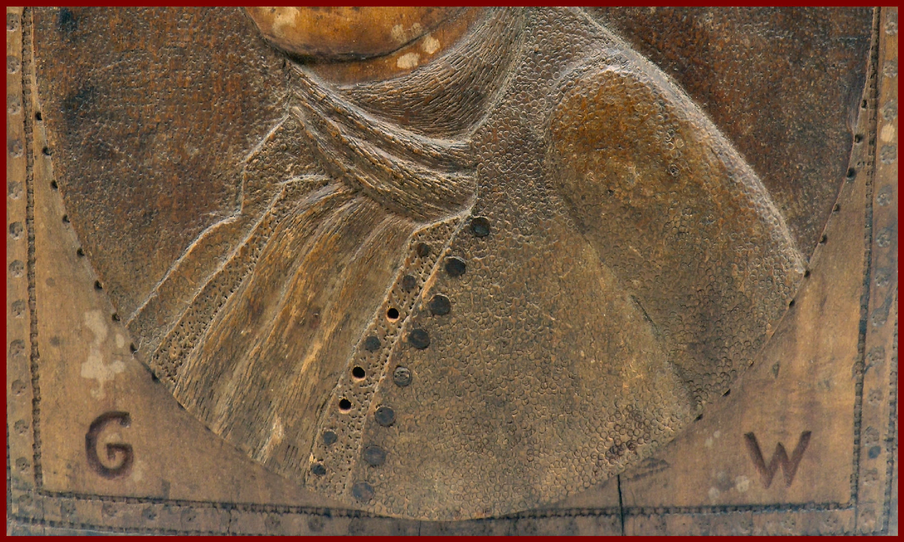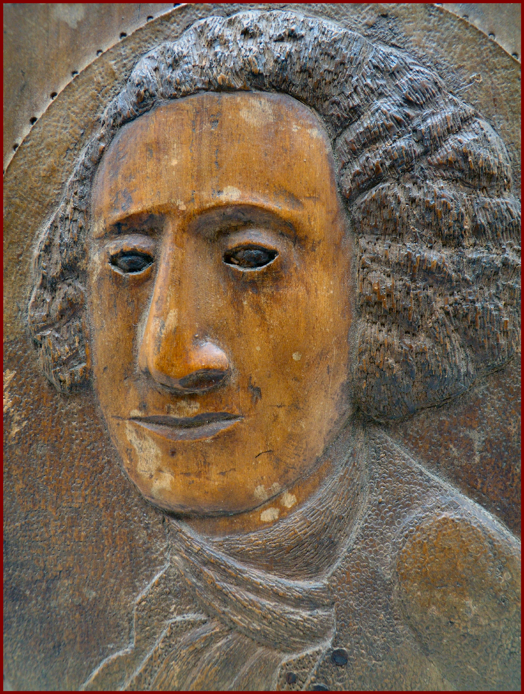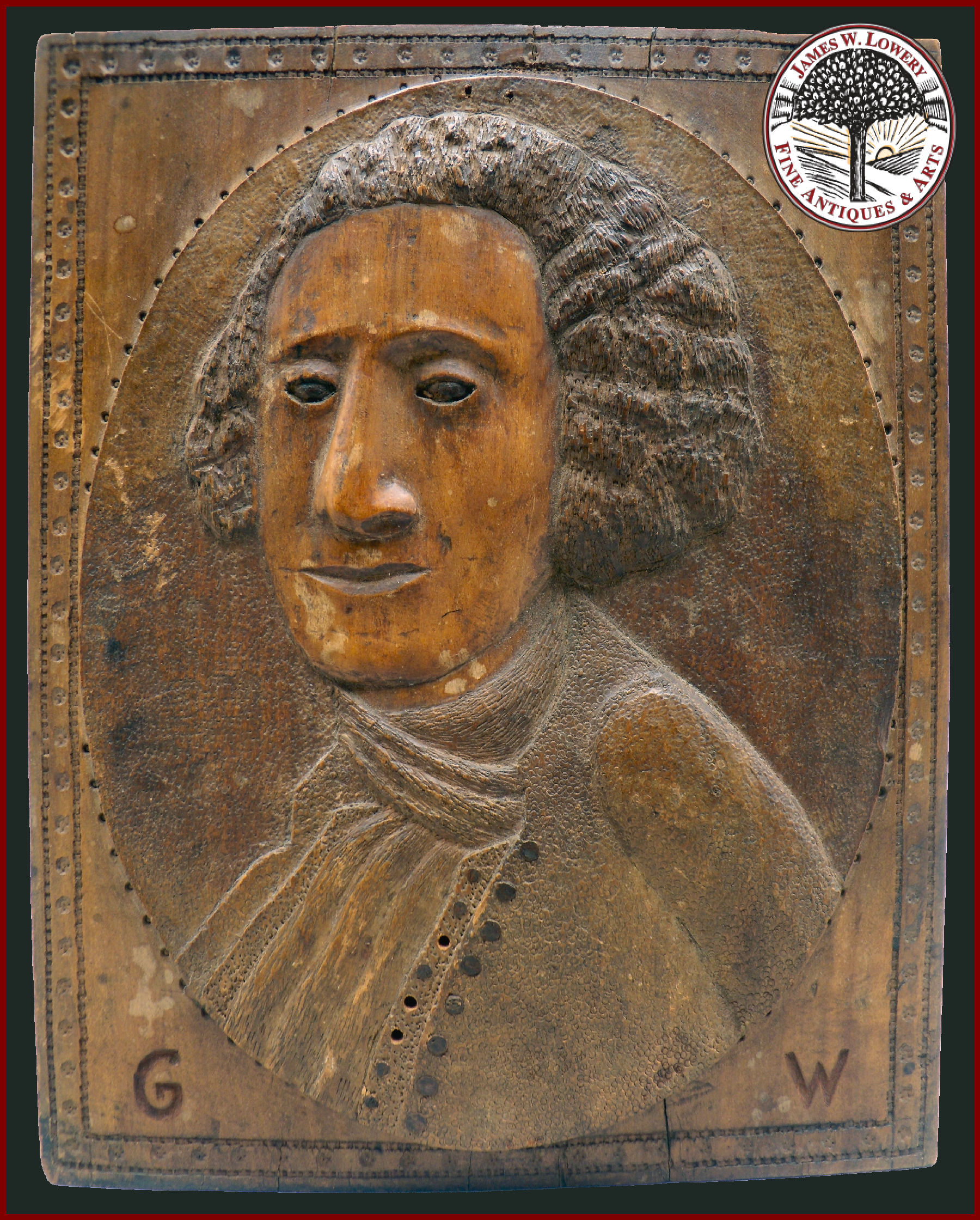 Wooden relief carved bust portrait of George Washington. A unschooled folk art carving with a one of a kind personal expression. The folk artist carving is primitive in style and symbolic in meaning.