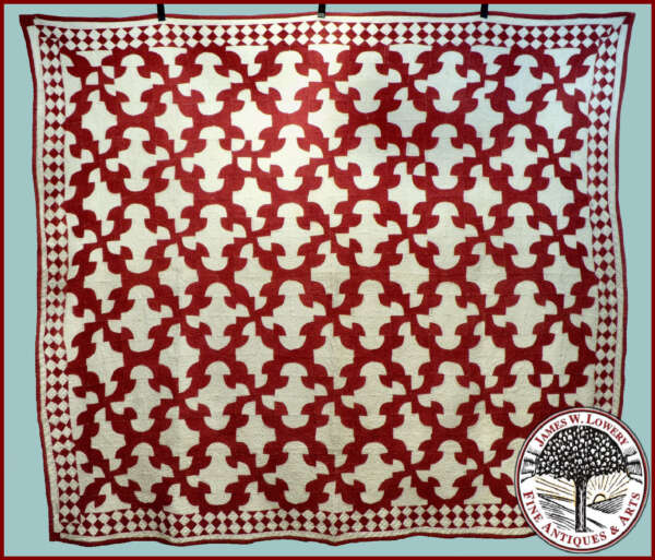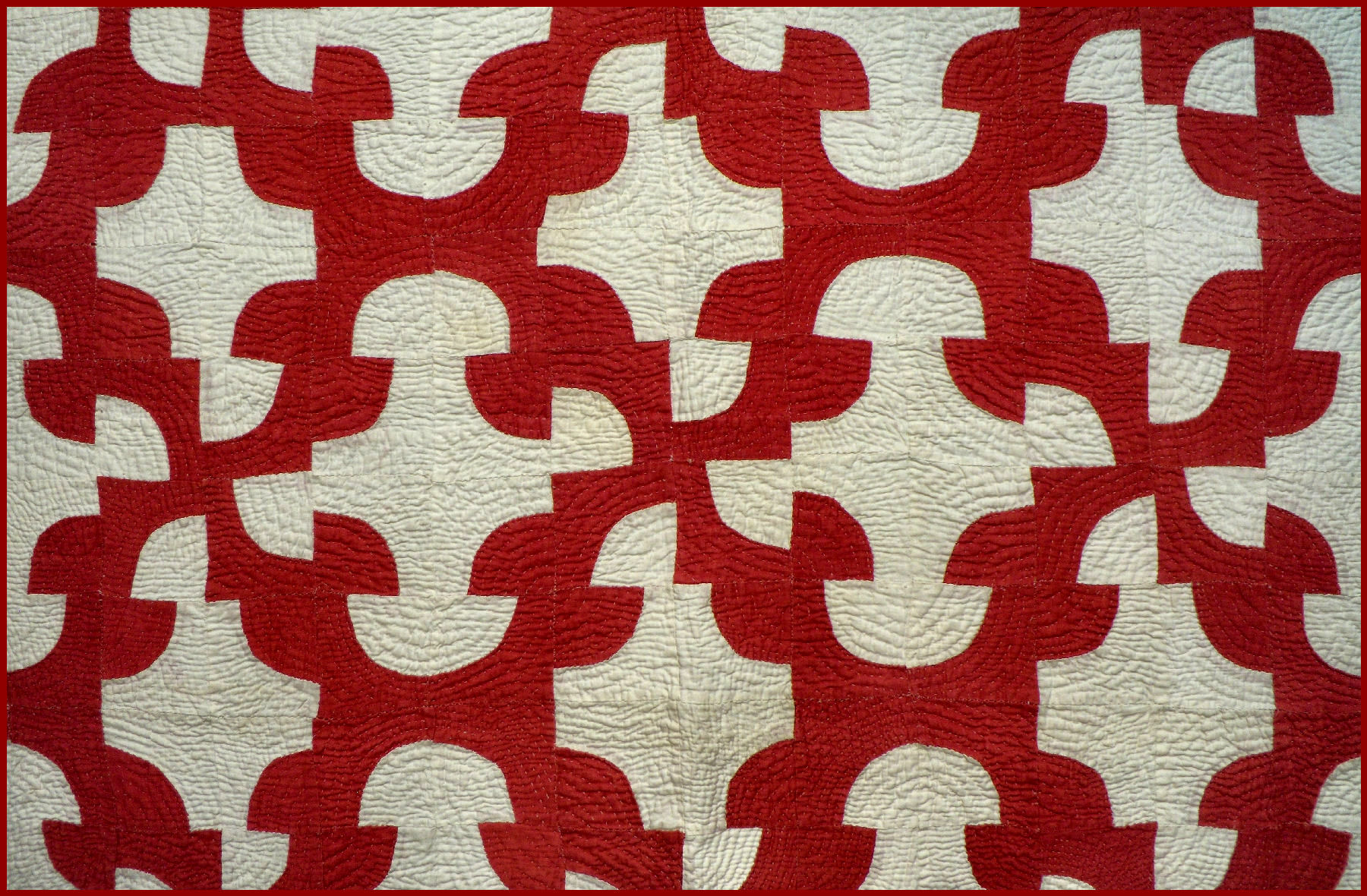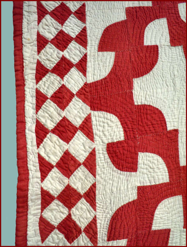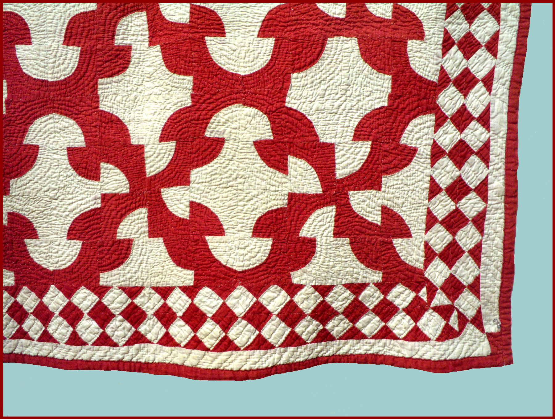 The pattern itself is simple however the particular arrangement of blocks with curved seams makes its construction rather complex. Diamond & sawtooth border. This quilt’s pattern is strongly associated with the woman’s Christian Temperance Union (WCTU) which was formed to uphold religious a& moral standards