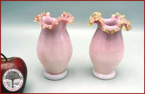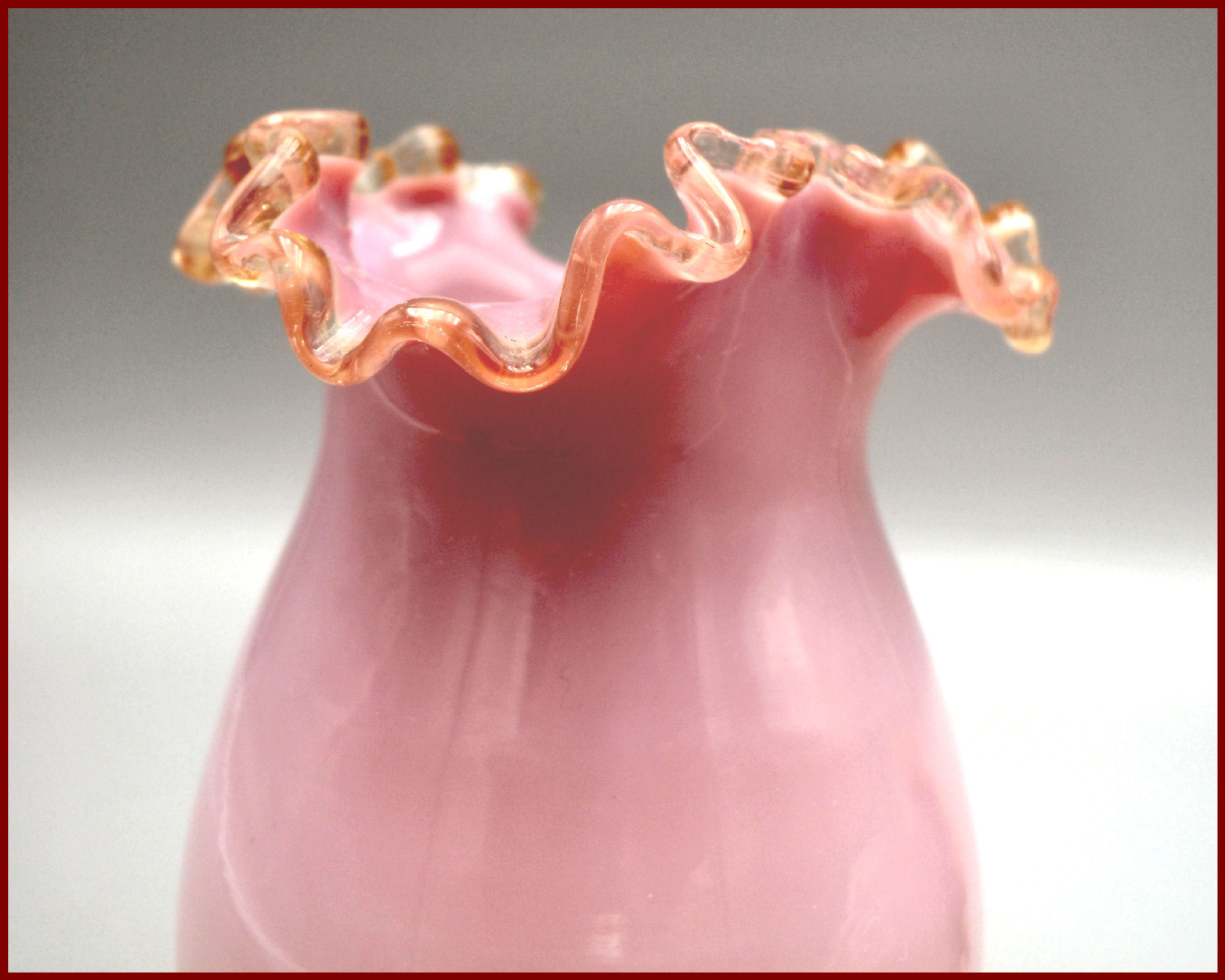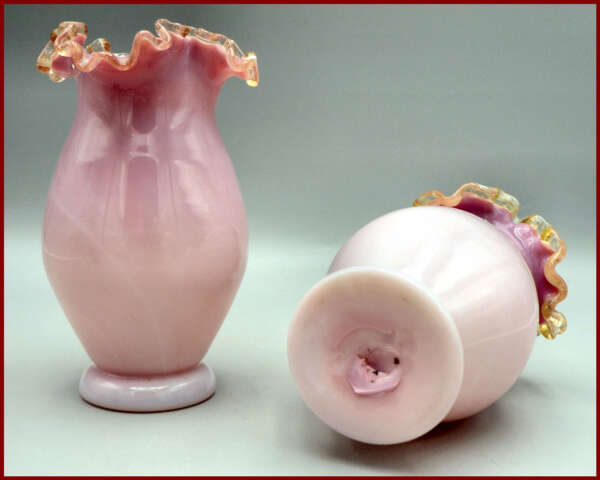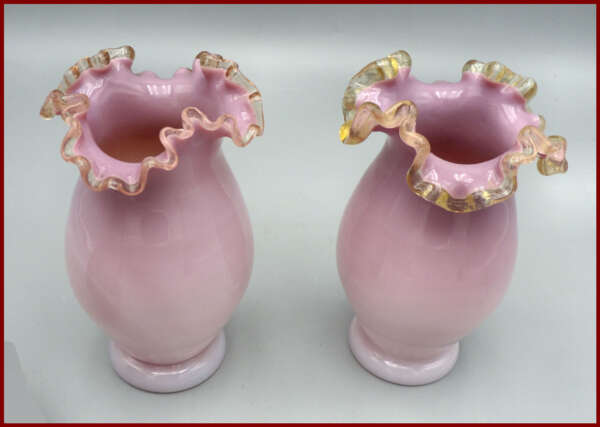 A stunning pair of Victorian hand blown white and pink cased glass vases with ruffled rim, featuring a lovely shade of pink, in excellent condition.