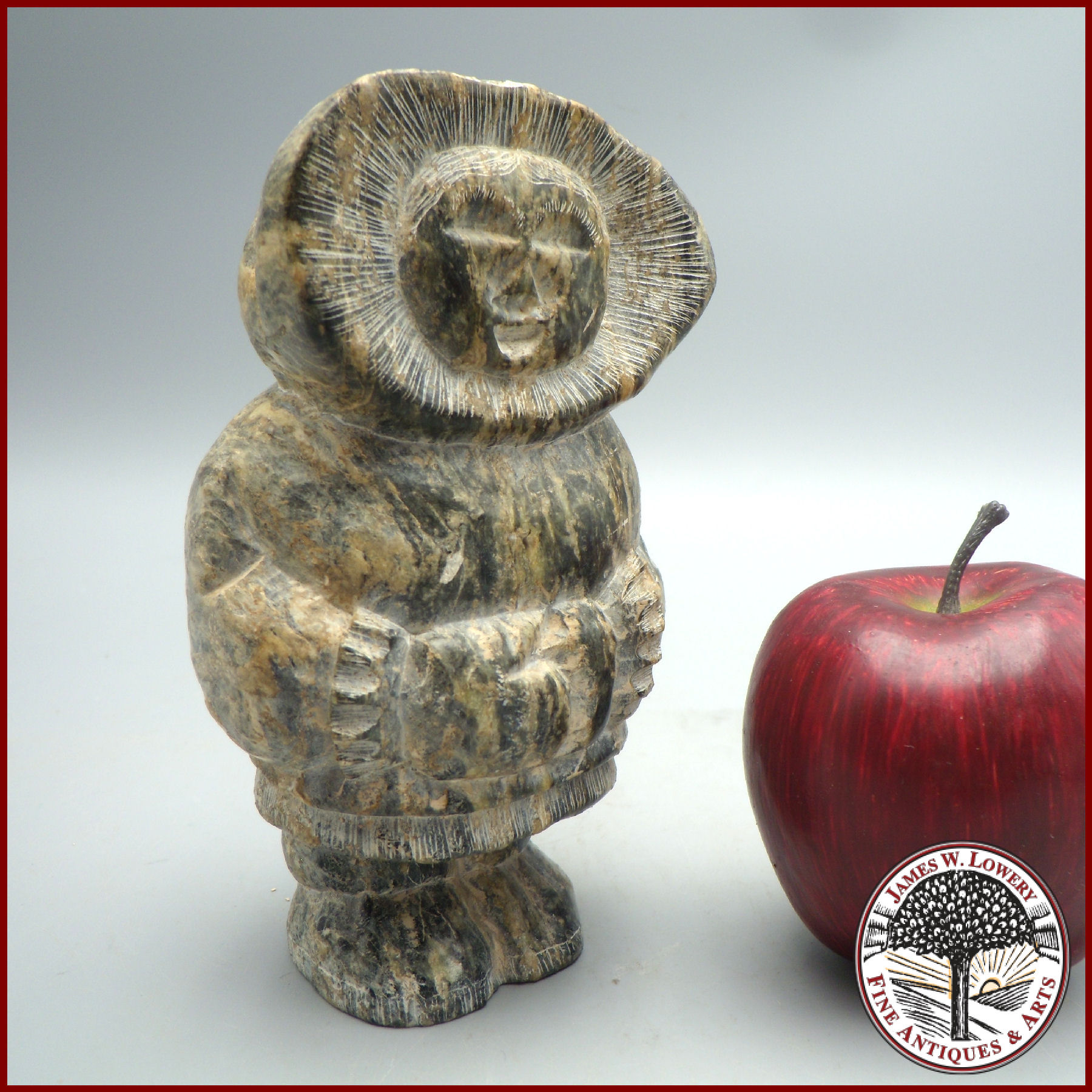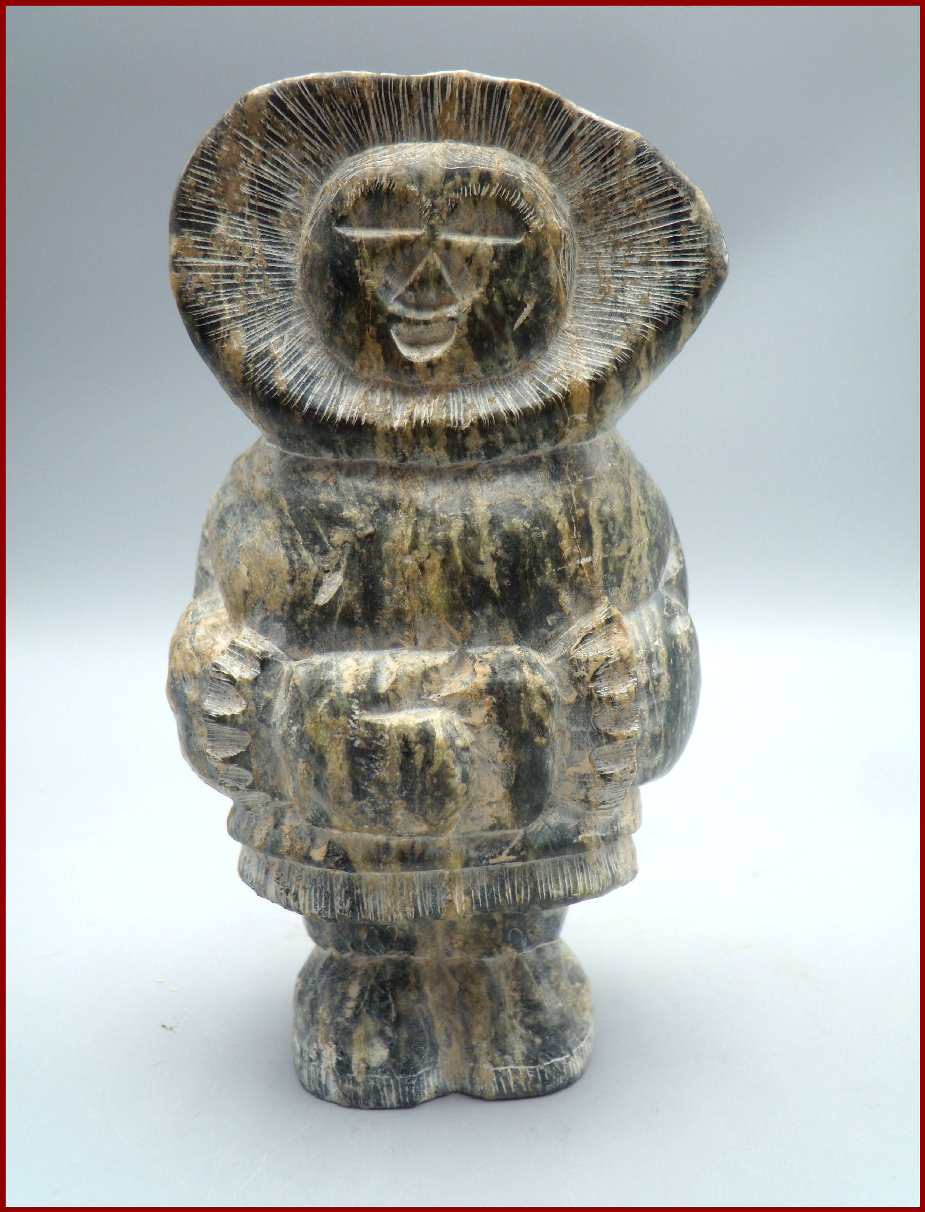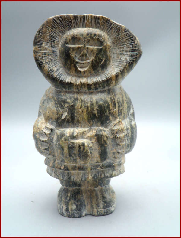 A fine vintage Inuit soapstone carving by an unidentified artist. The soapstone has beautiful shades and many variations in color and lines that adds to the carved and incised details. The incised decoration around hood, cuffs, bottom of coat and boots are to mimic fur. Carving is a well detailed indigenous Inuit soapstone statue a young adult having a wonderful folk appeal to the Eskimo’s moon shaped face.