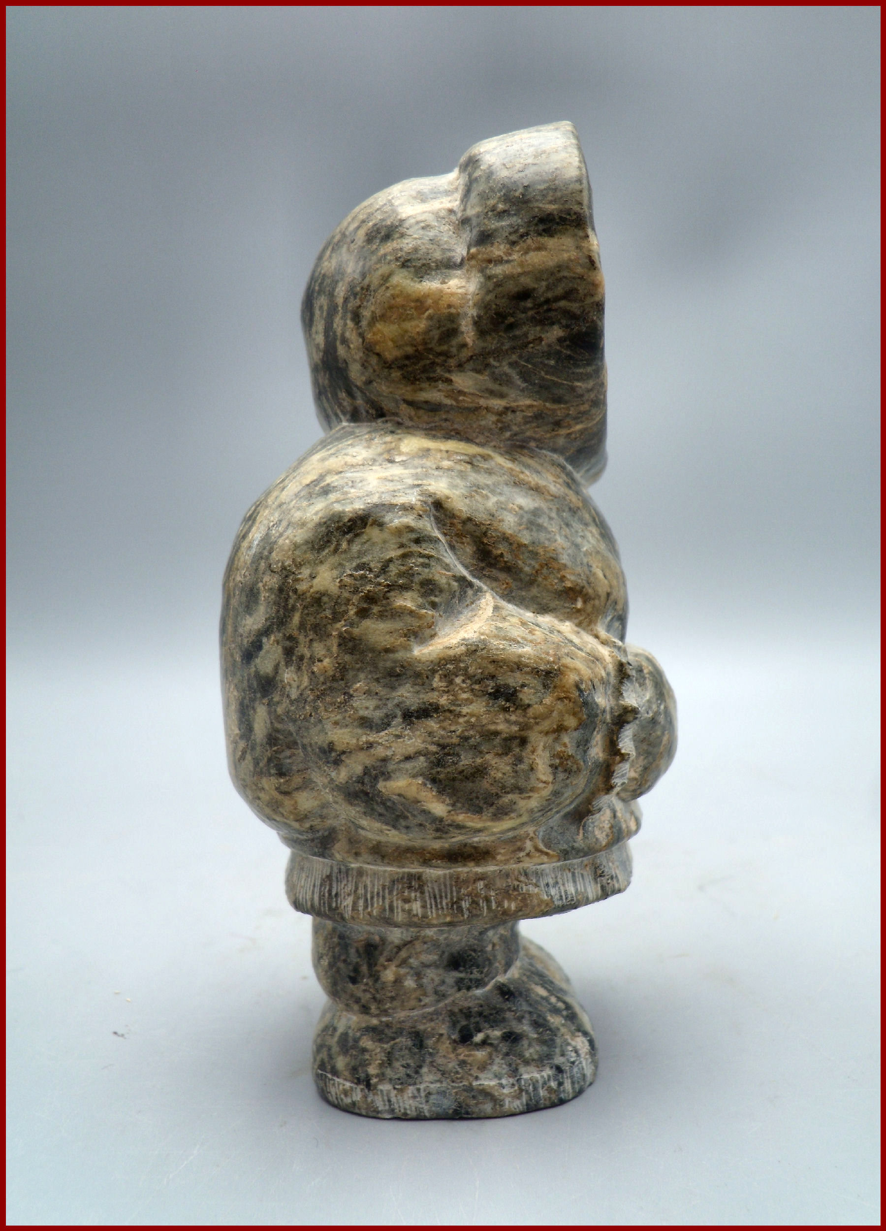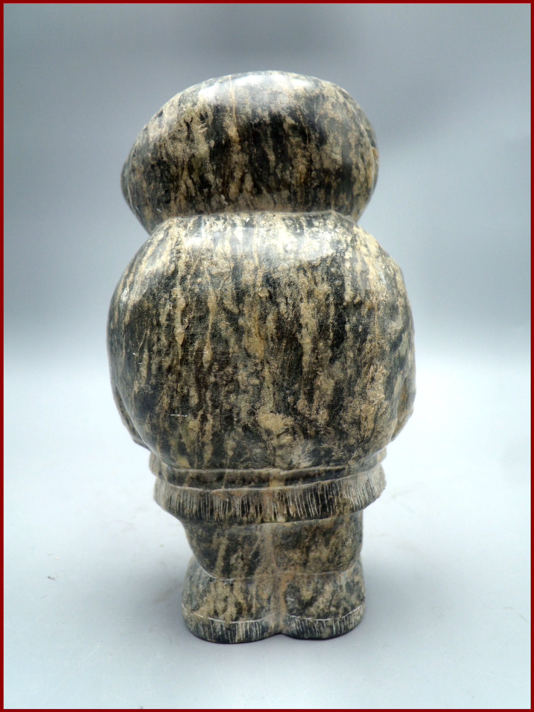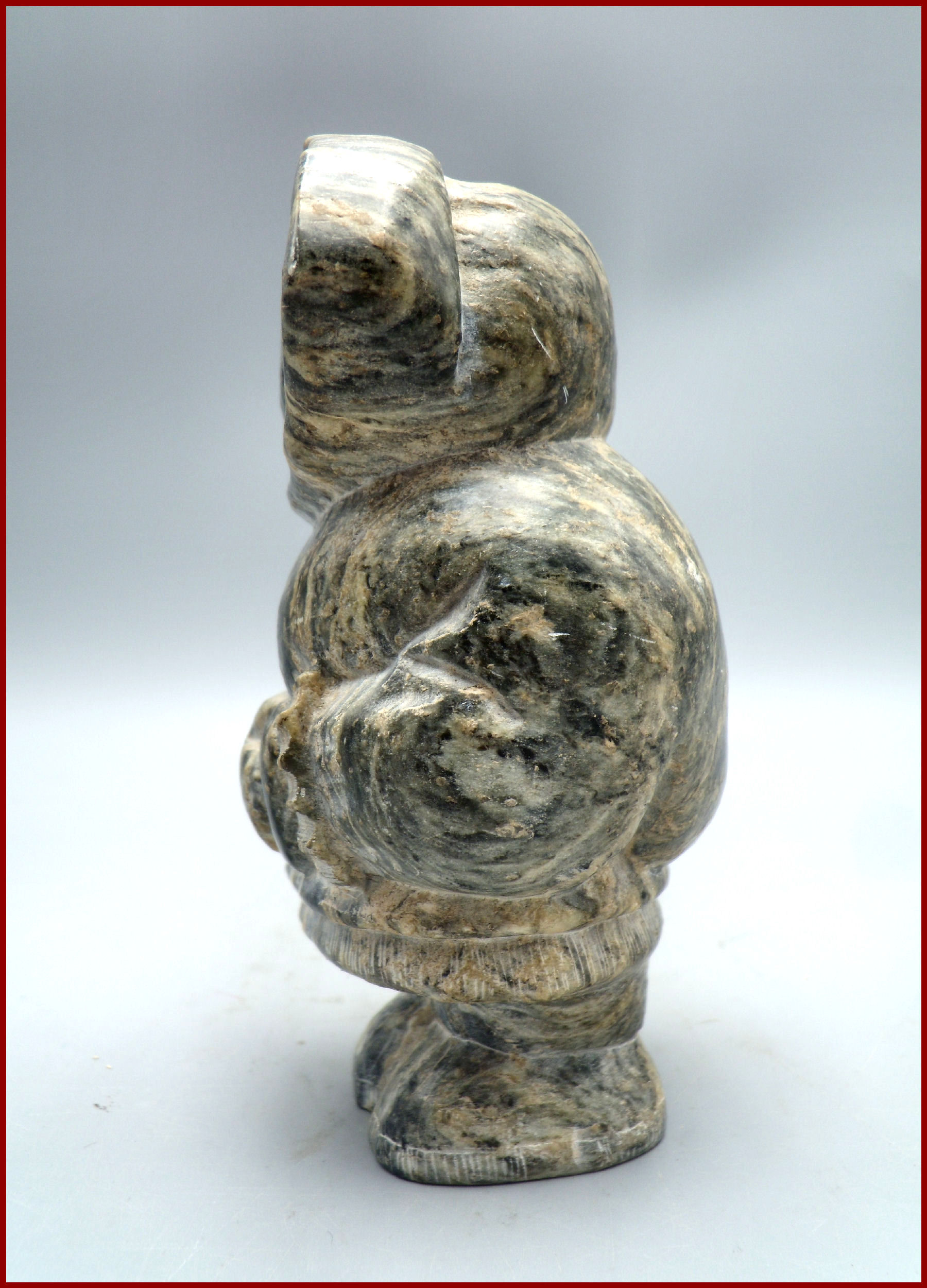 A fine vintage Inuit soapstone carving by an unidentified artist. The soapstone has beautiful shades and many variations in color and lines that adds to the carved and incised details. The incised decoration around hood, cuffs, bottom of coat and boots are to mimic fur. Carving is a well detailed indigenous Inuit soapstone statue a young adult having a wonderful folk appeal to the Eskimo’s moon shaped face.